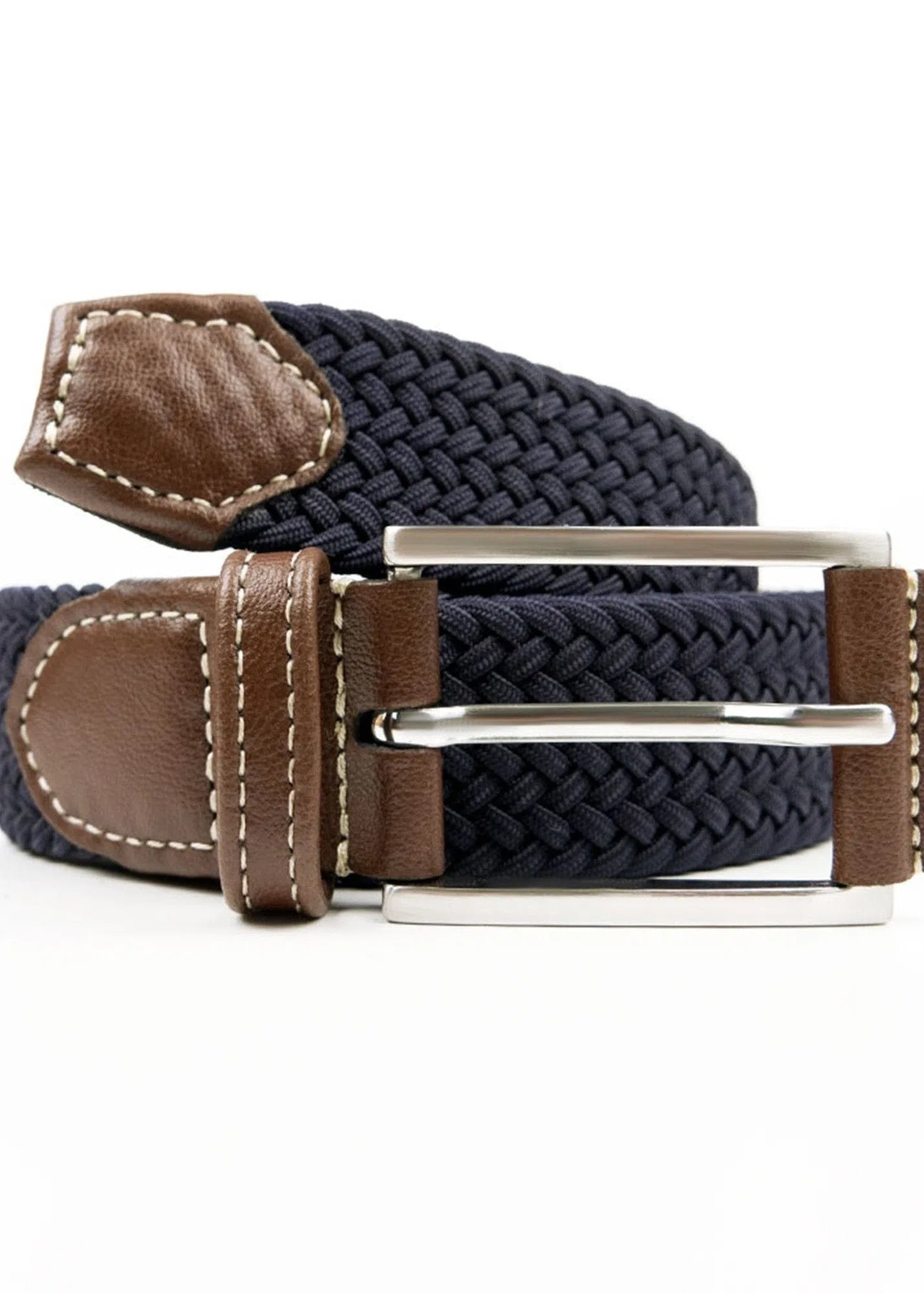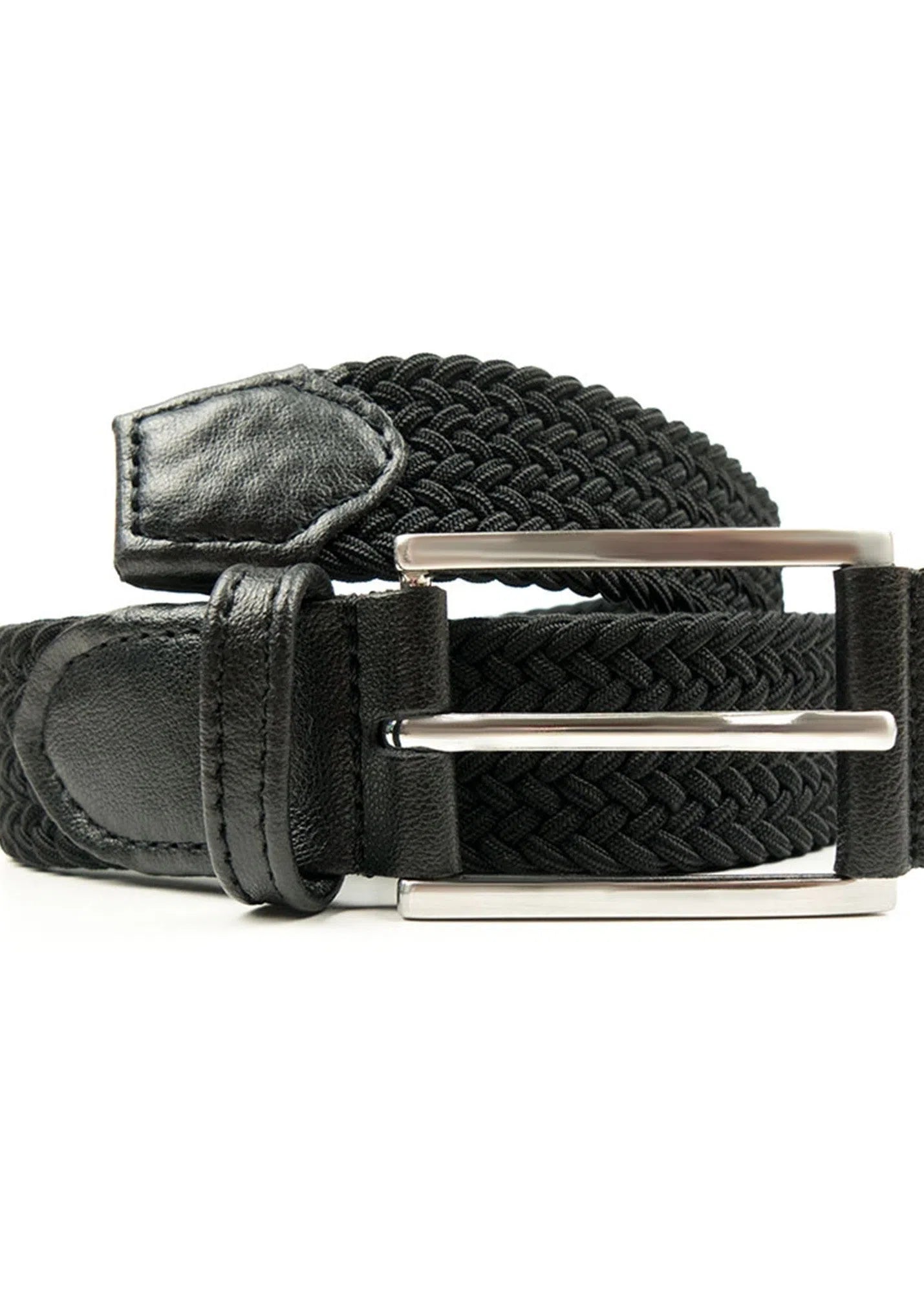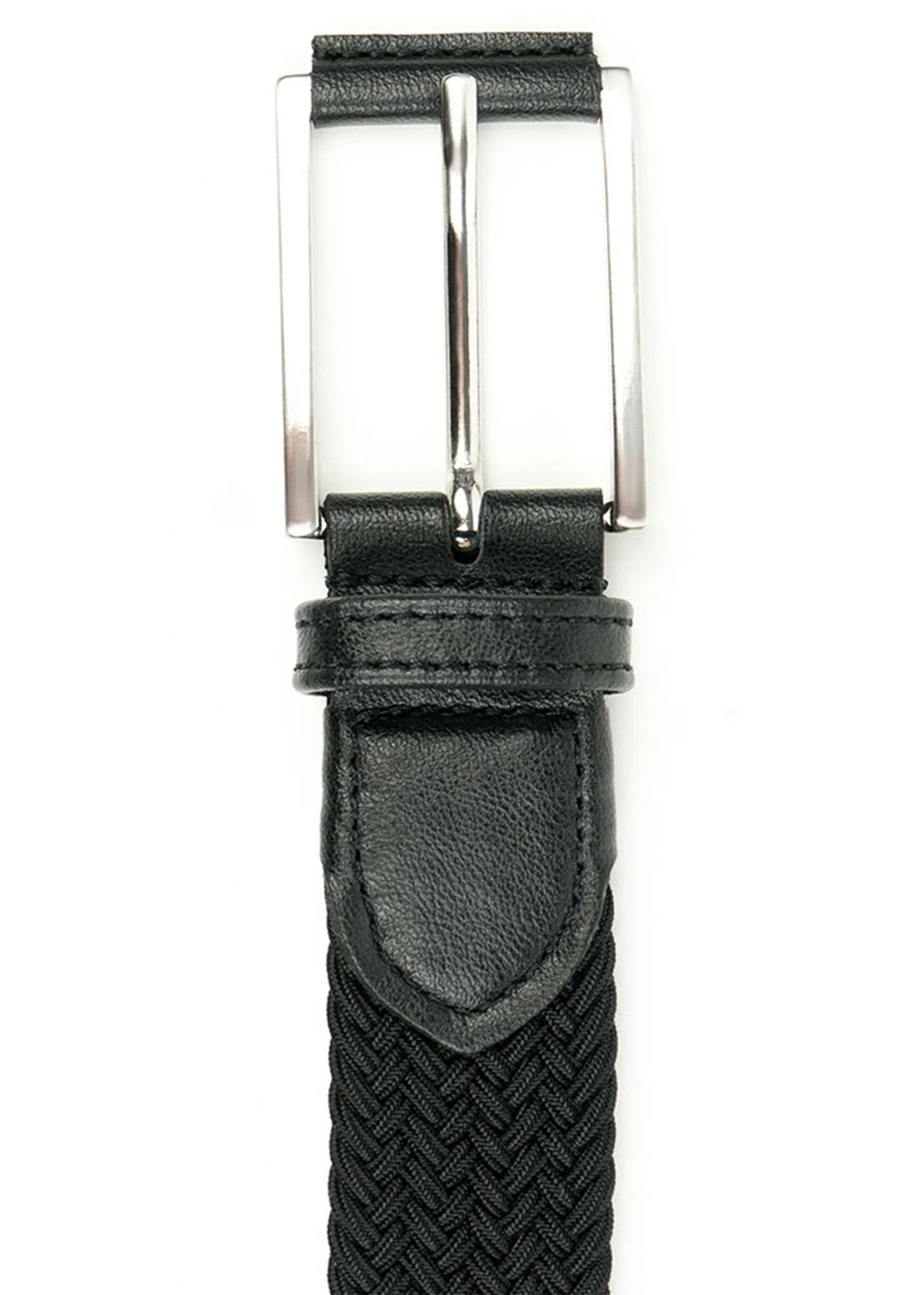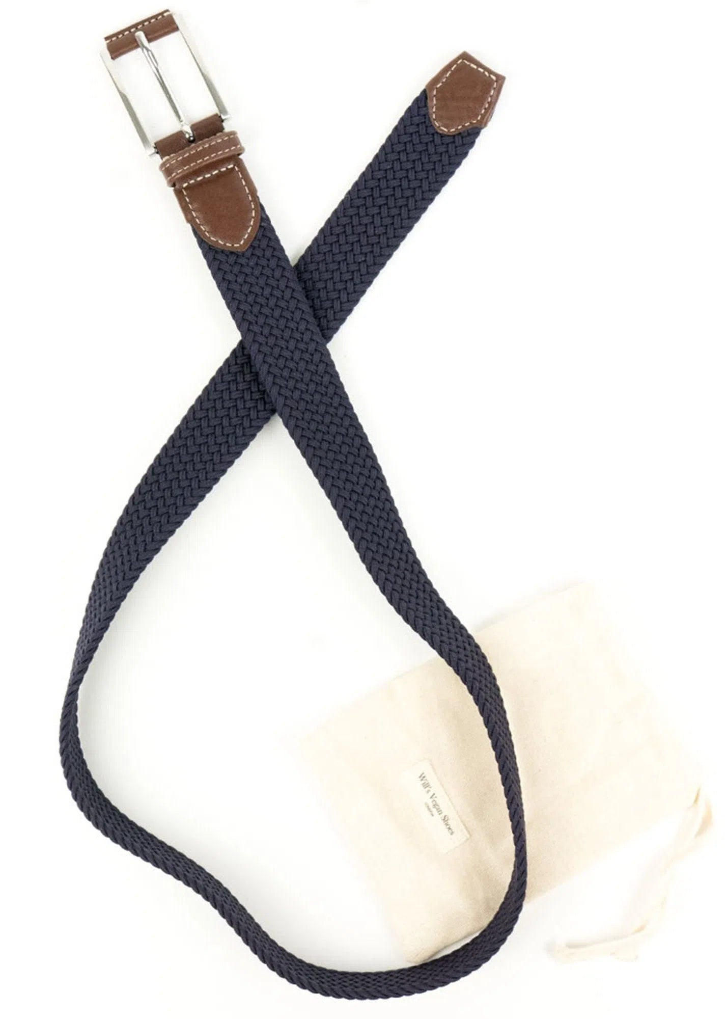 Woven elasticated fabric set with solid heavy metal buckle and hand stitched vegan leather made with plants created with bio oil sourced from organic cereal crops grown in Northern Europe in a carbon neutral process.