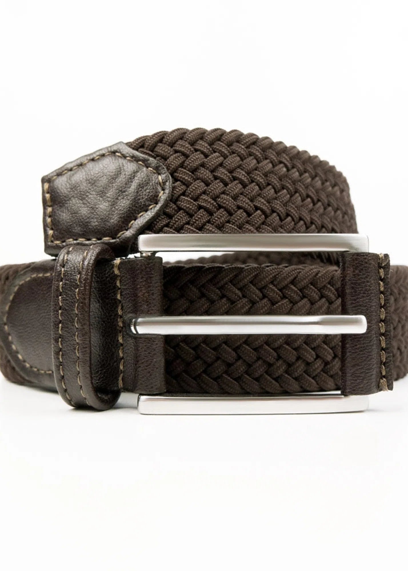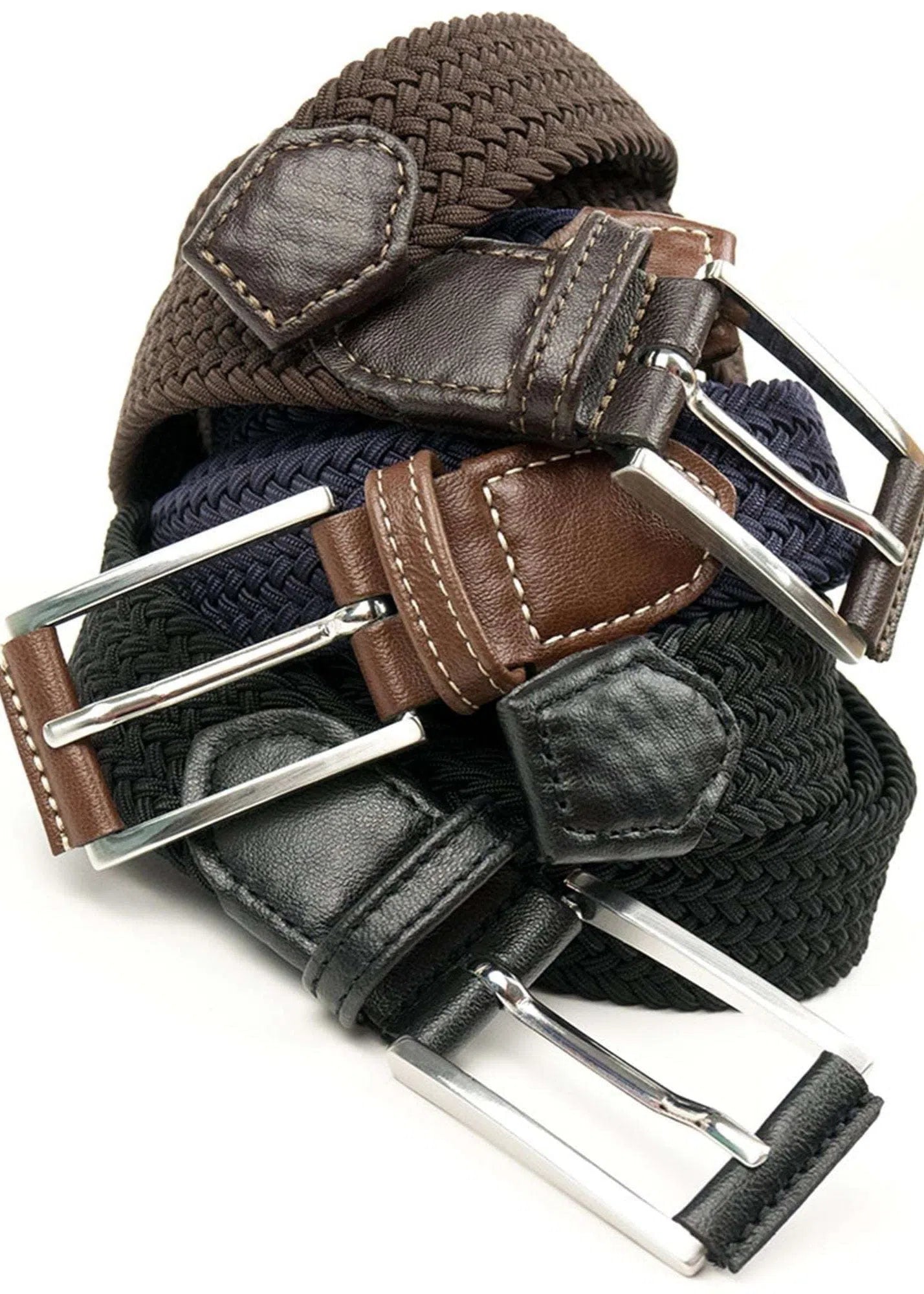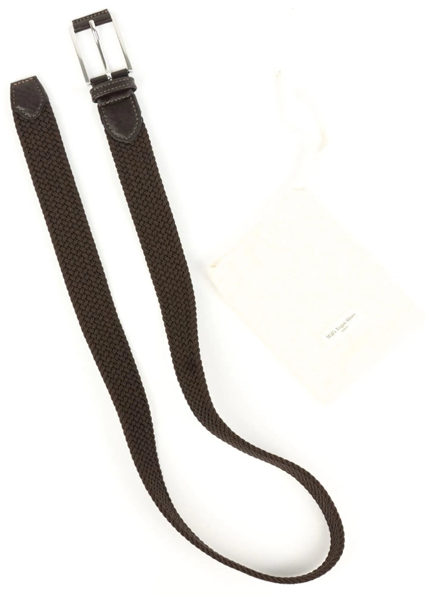 Woven elasticated fabric set with solid heavy metal buckle and hand stitched vegan leather made with plants created with bio oil sourced from organic cereal crops grown in Northern Europe in a carbon neutral process.