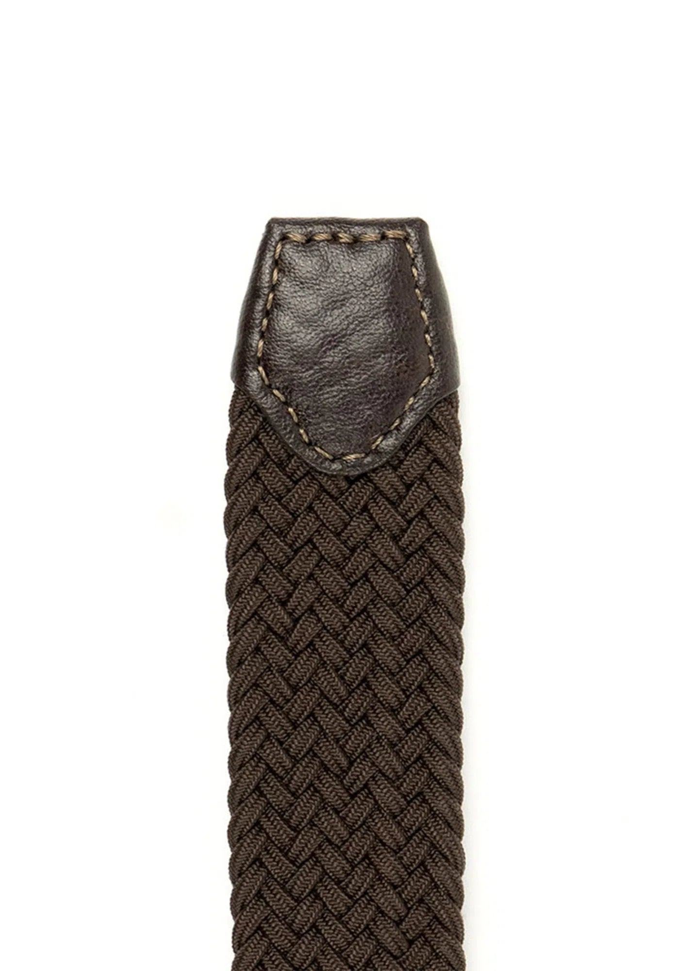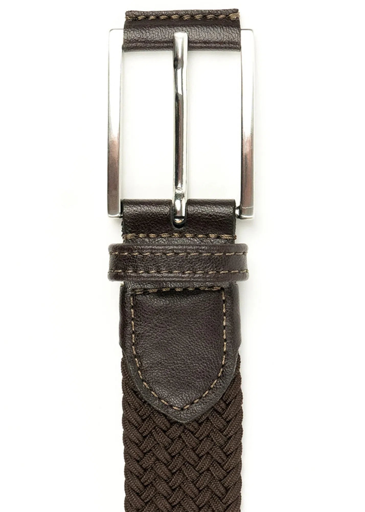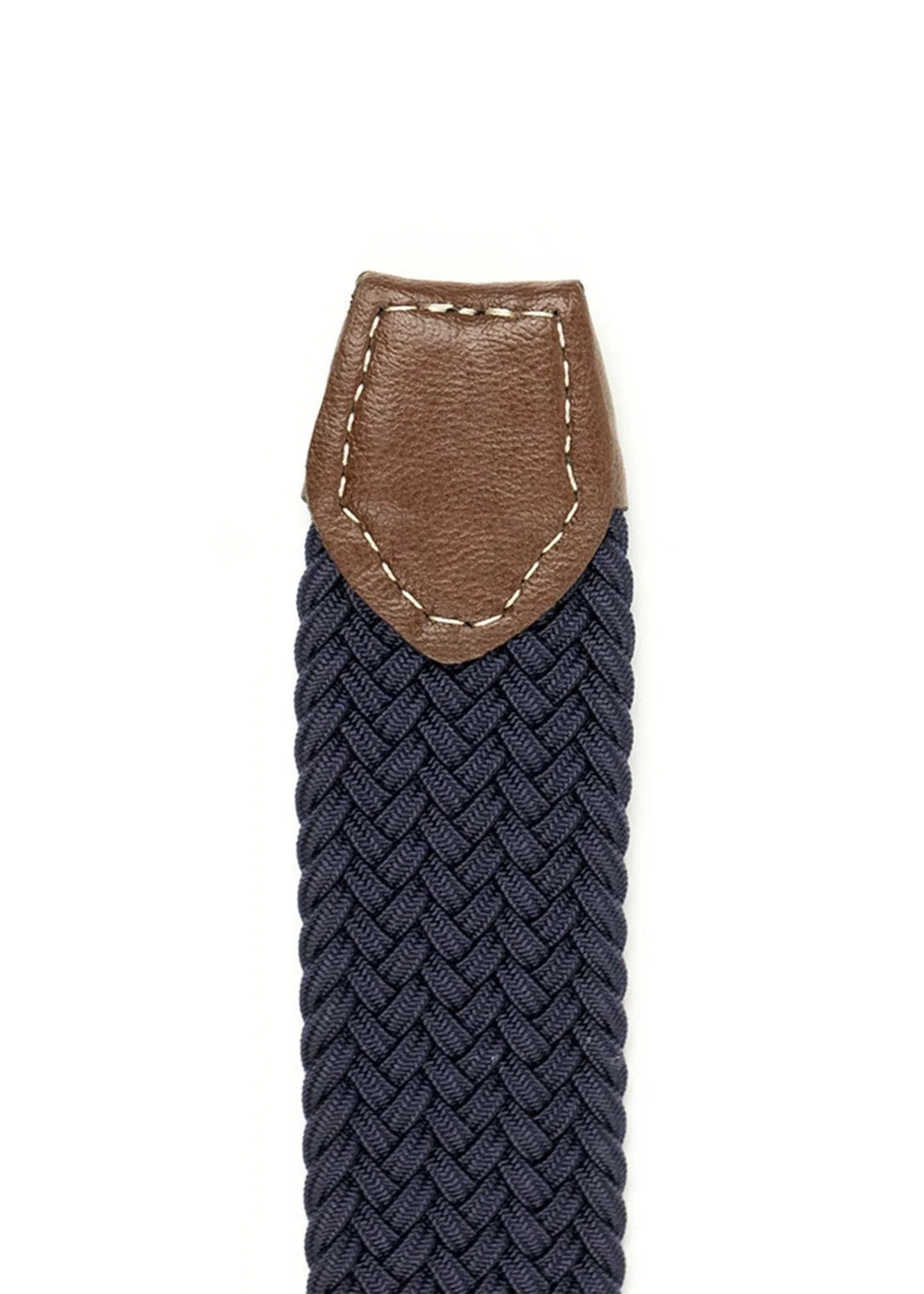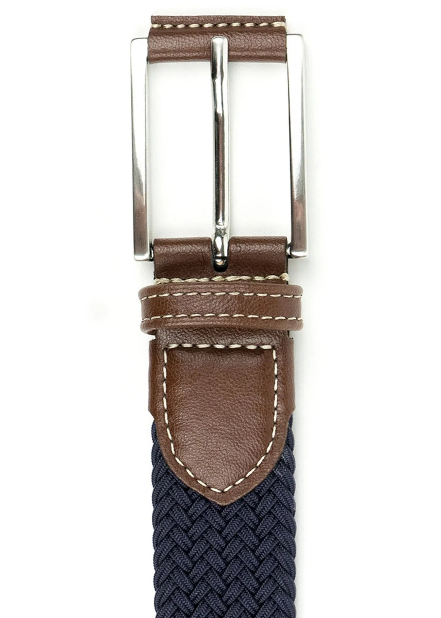 Woven elasticated fabric set with solid heavy metal buckle and hand stitched vegan leather made with plants created with bio oil sourced from organic cereal crops grown in Northern Europe in a carbon neutral process.