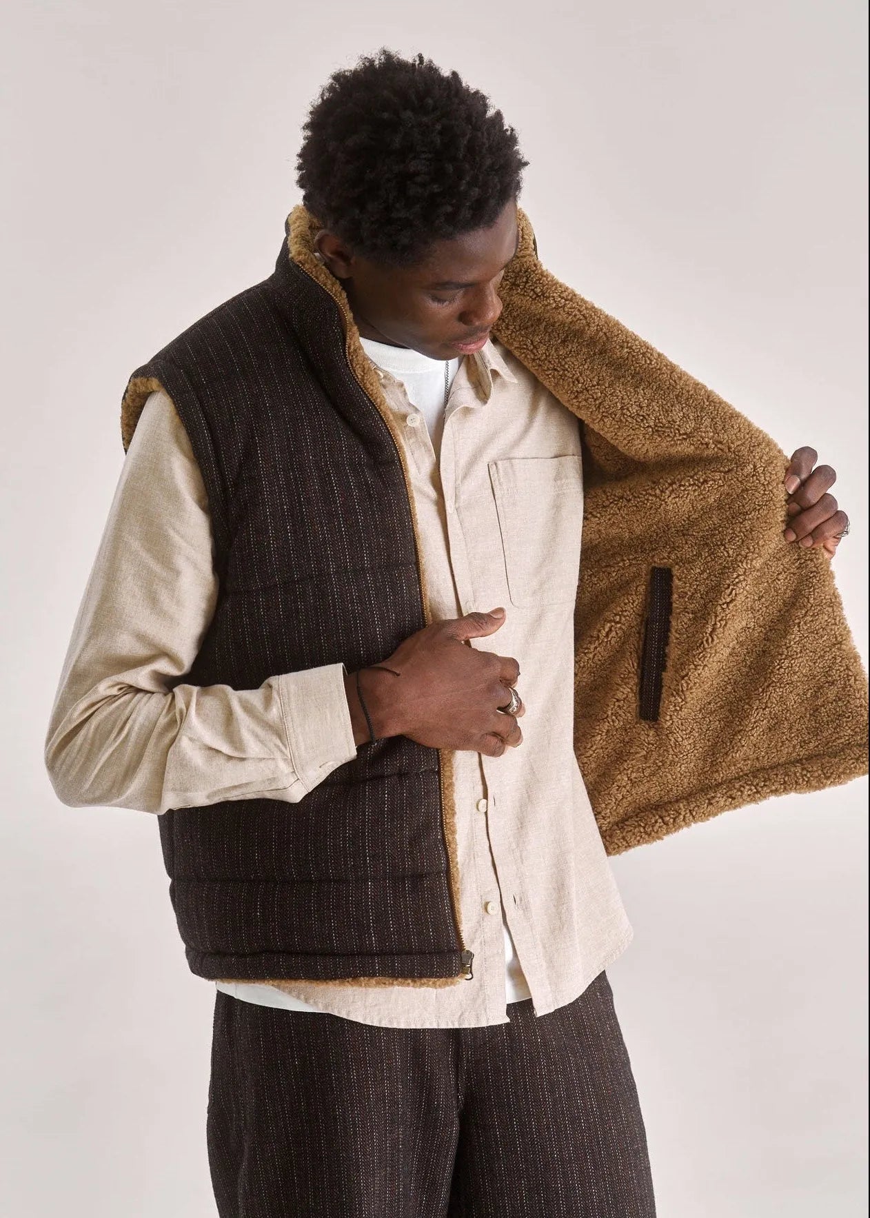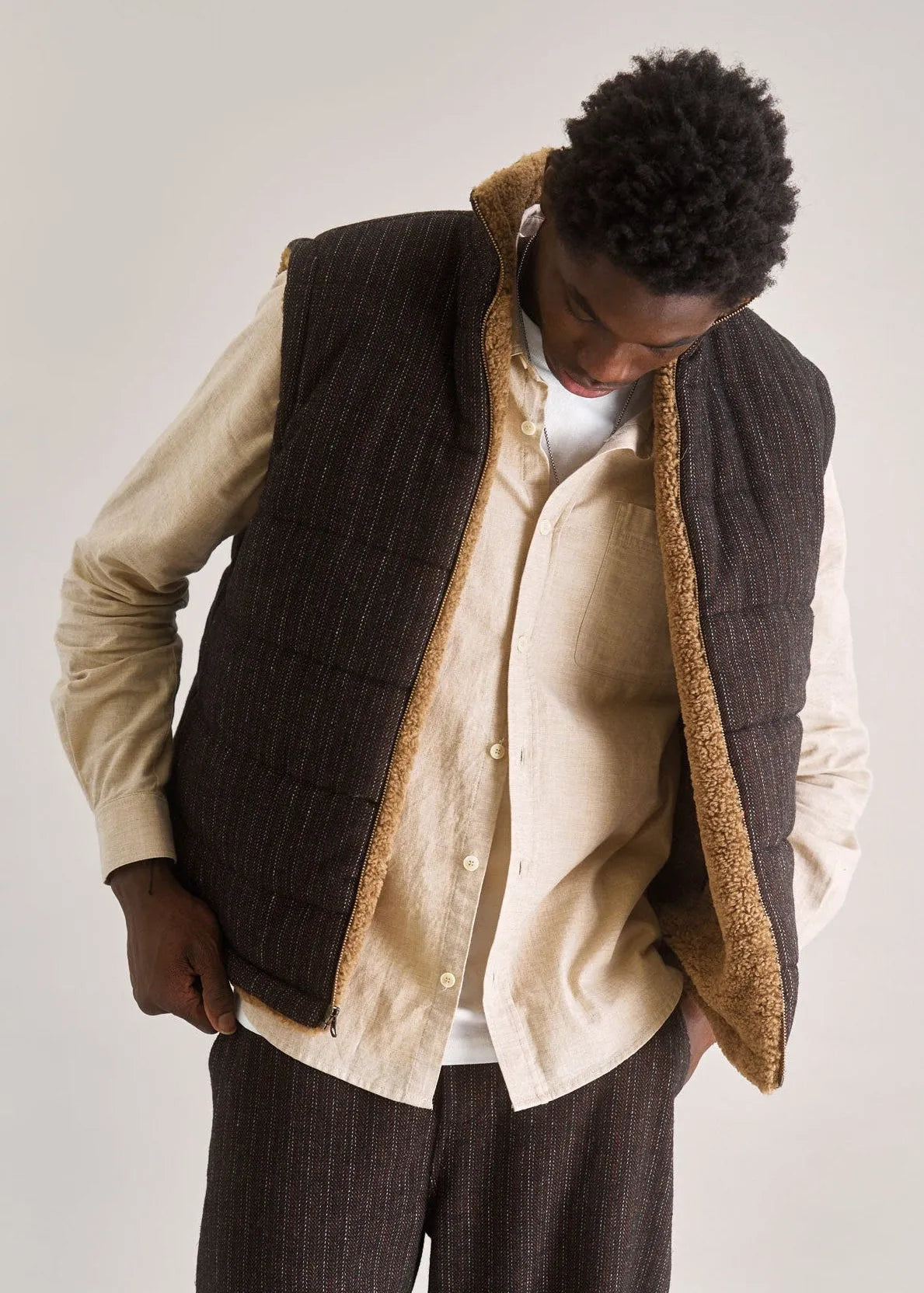 The CHRIS Reversible Fleece Gilet in Mink combines sustainability with style. Made from 100% recycled PET fleece on one side and a blend of 80% recycled polyester and 20% recycled wool pinstripe twill on the other, it offers versatile looks for any occasion. Ethically crafted in a SEDEX-audited factory, this gilet features a zip fastening and practical side pockets, providing warmth and functionality while supporting responsible production. Perfect for those who value quality and conscious fashion.