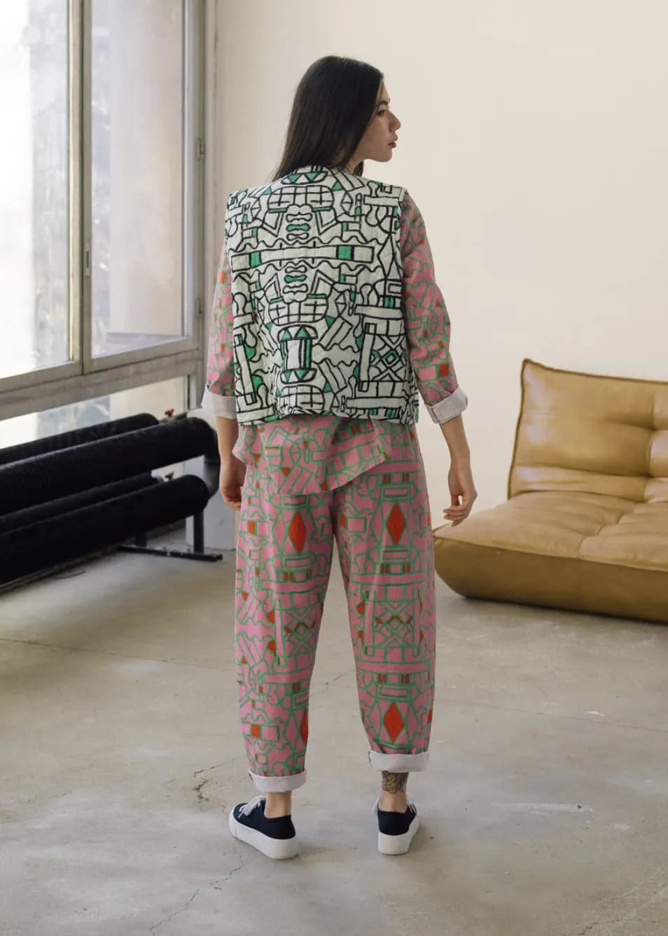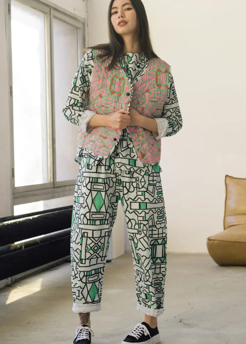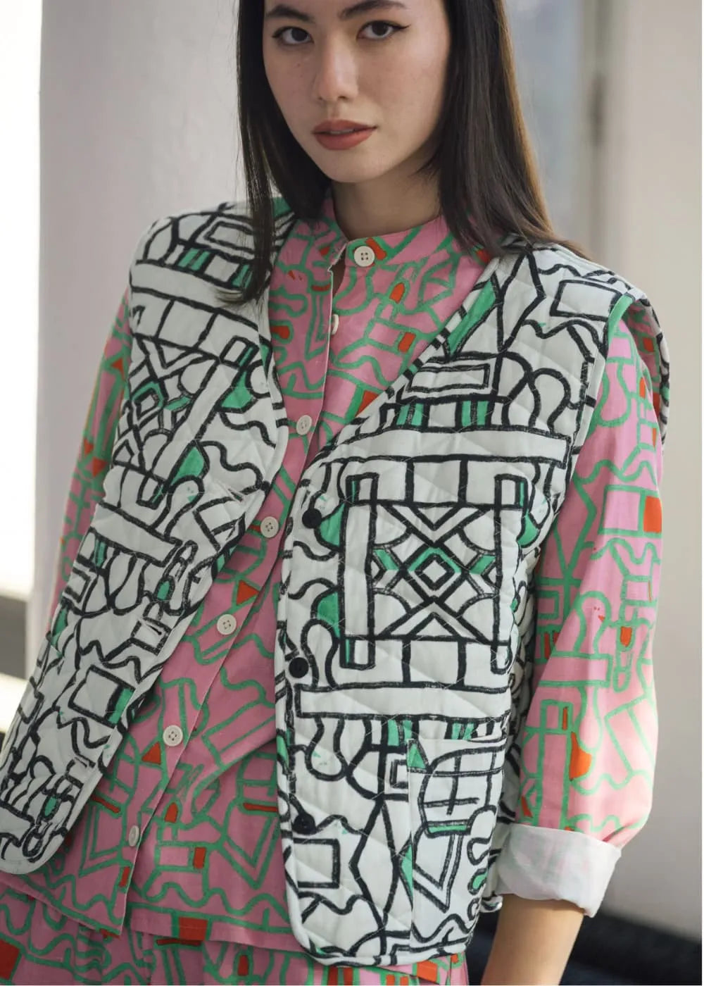 This best selling gilet is back, this time in two new playful Driftstate prints. Featuring pockets and reversible design (yep, you read that right!), this gilet has black, chalk, and bright green on one side and pink, green, and red on the other. Perfect for layering over anything from jackets to dresses, all made from sustainable organic cotton and linen. And the quilting? Also organic cotton, because we're all about that plastic-free life, baby! Get ready to mix and match with endless possibilities.