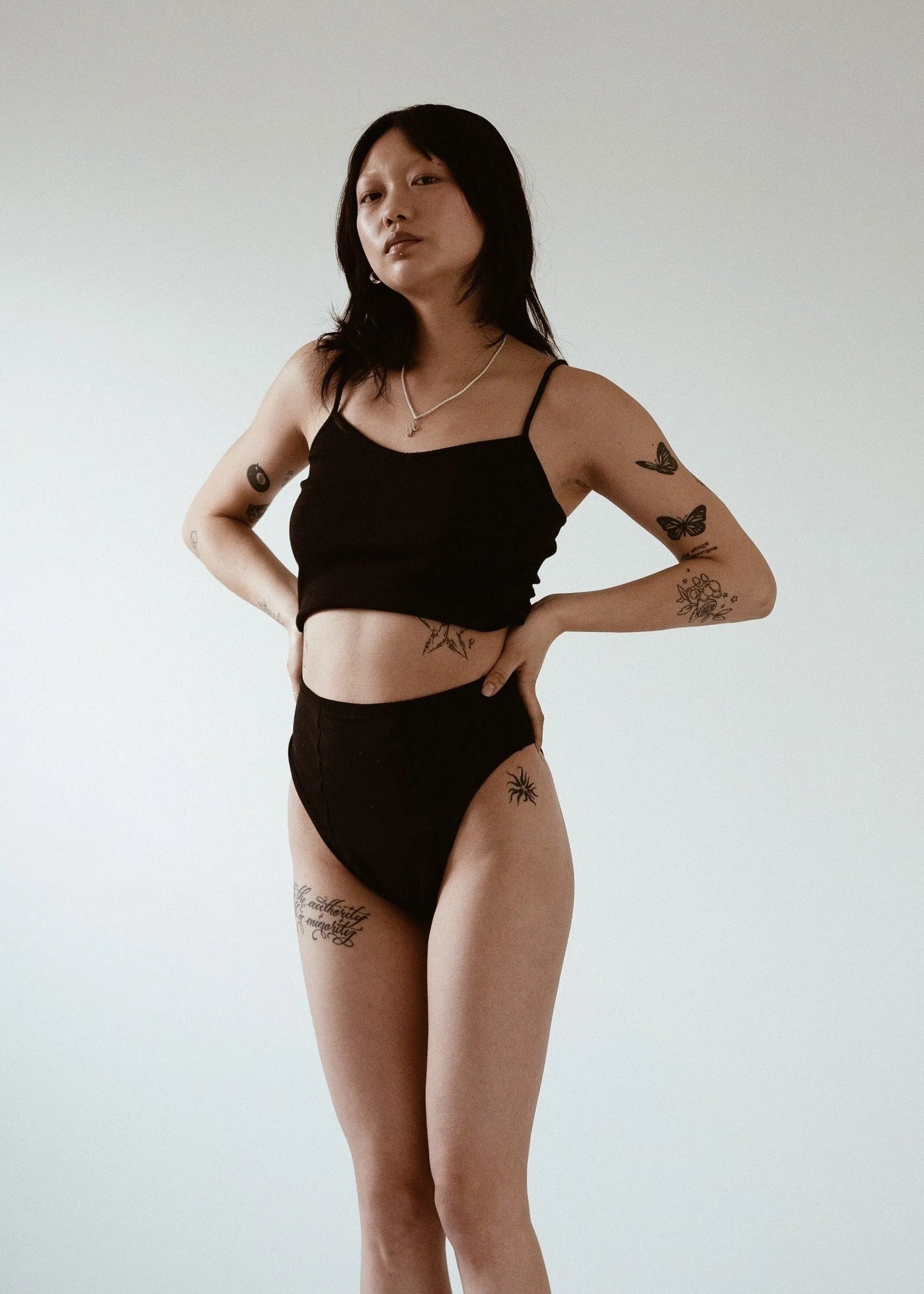 Cheeky high-cut style with extra high waist and soft bound seams.