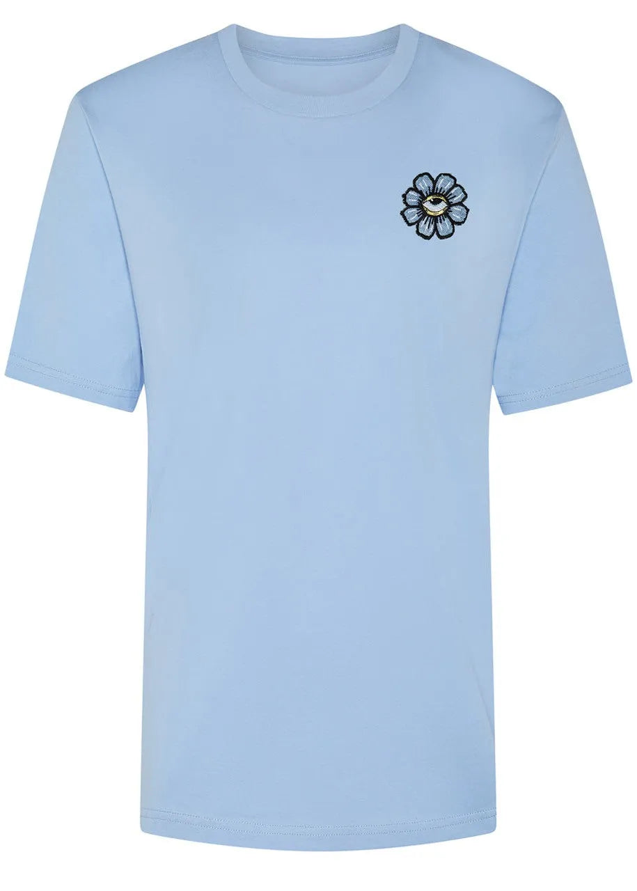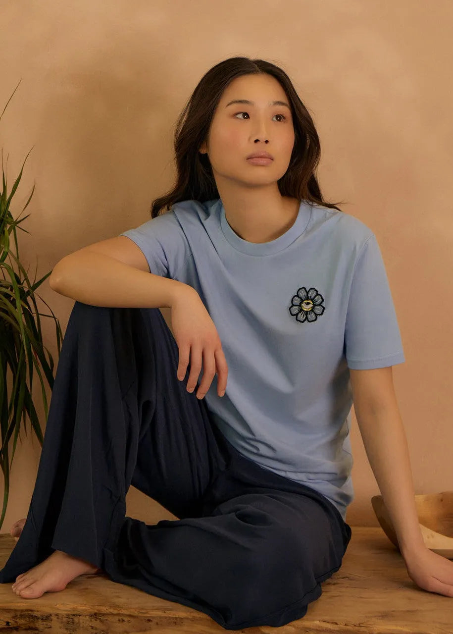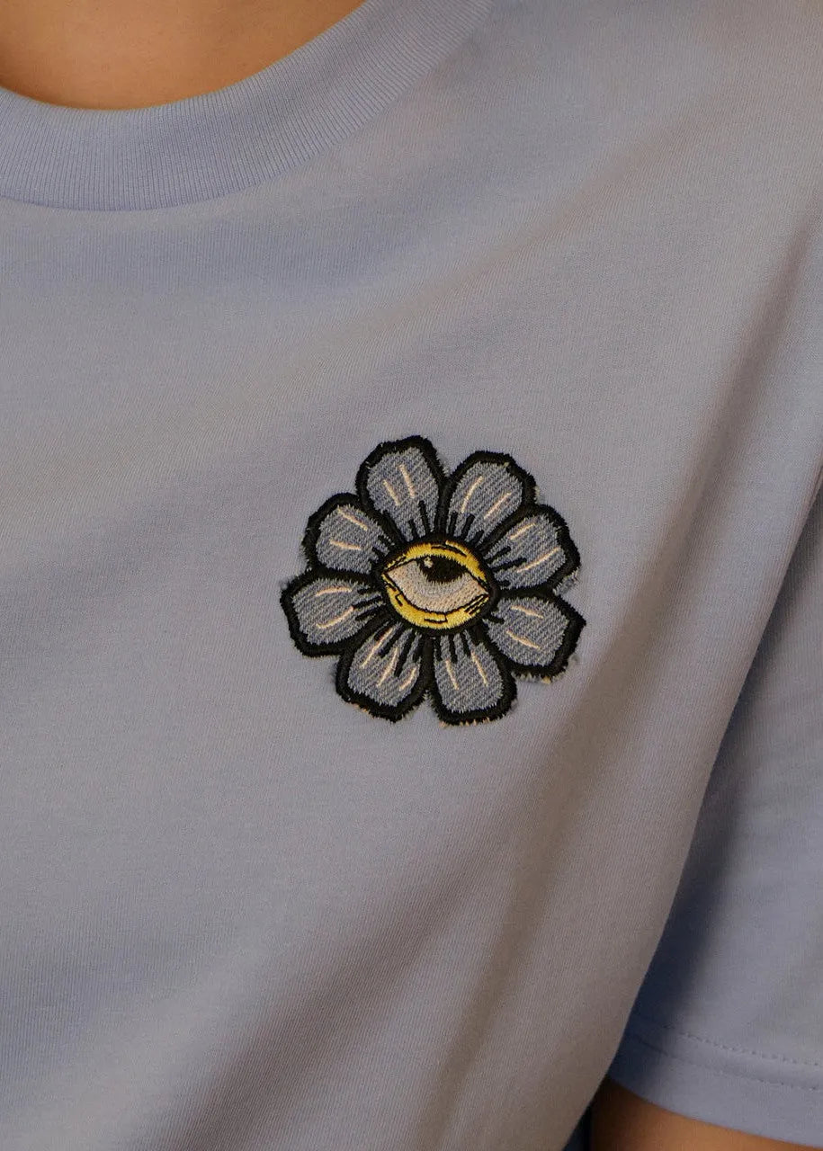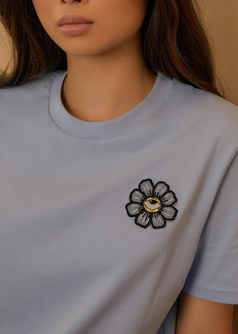 Women's Blue Eyed Flower Upcycled Appliqué T-Shirt - Blue