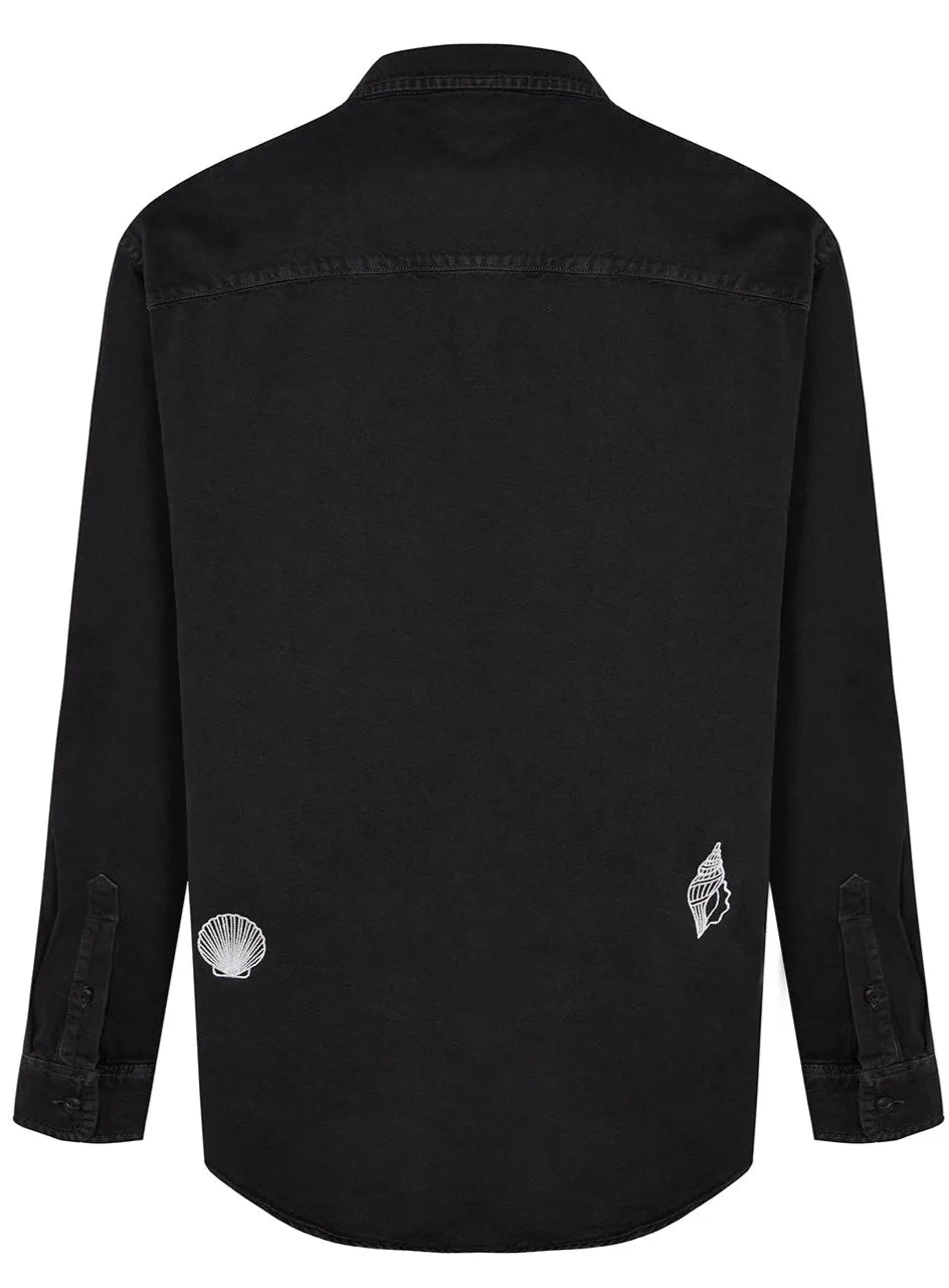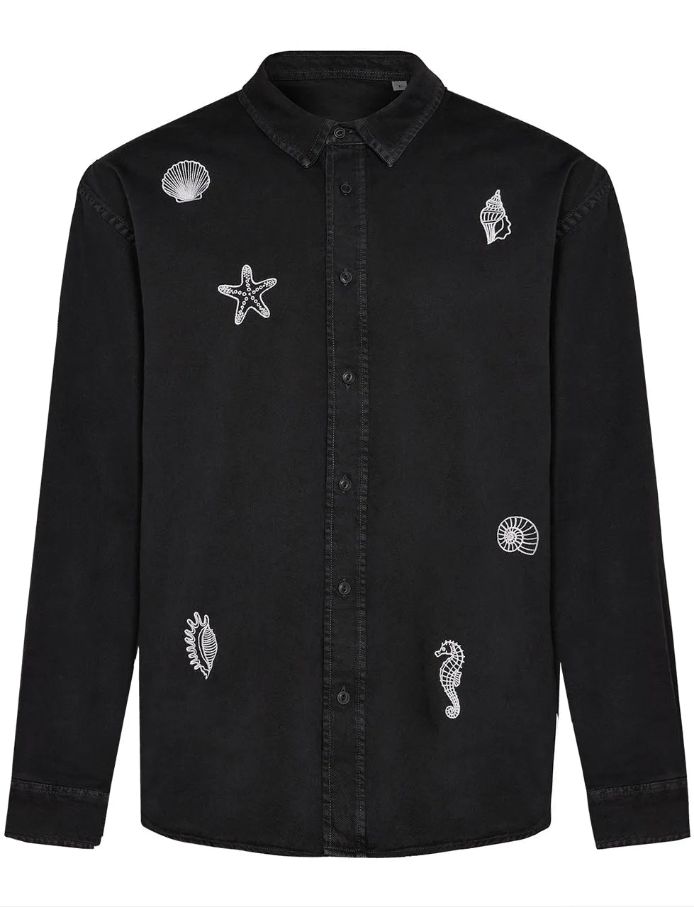 The shirt features beautiful shell embroidery that runs across the body, adding a unique and sophisticated element to its classic design. The shirt has a slight distressed look. It has been expertly embroidered in London, the intricate shell detailing elevates the look of this versatile piece, making it ideal for both casual and dressier occasions.
