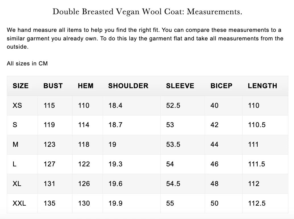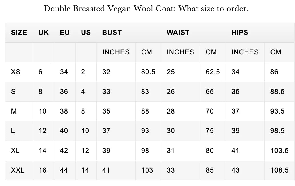 This understated and sophisticated coat is a timeless style you're sure to wear for years. Tailored in Italy from “vegan wool” and designed in a loose, double-breasted silhouette, subtly structured with shoulder padding. To keep you warm there is a 60g thermal insulated lining. The front of the jacket is fastened with four matt finish recycled buttons. Italian made REACH certified viscose lining ensures smooth layering. You can put your carry essentials into the two deep slip pockets.