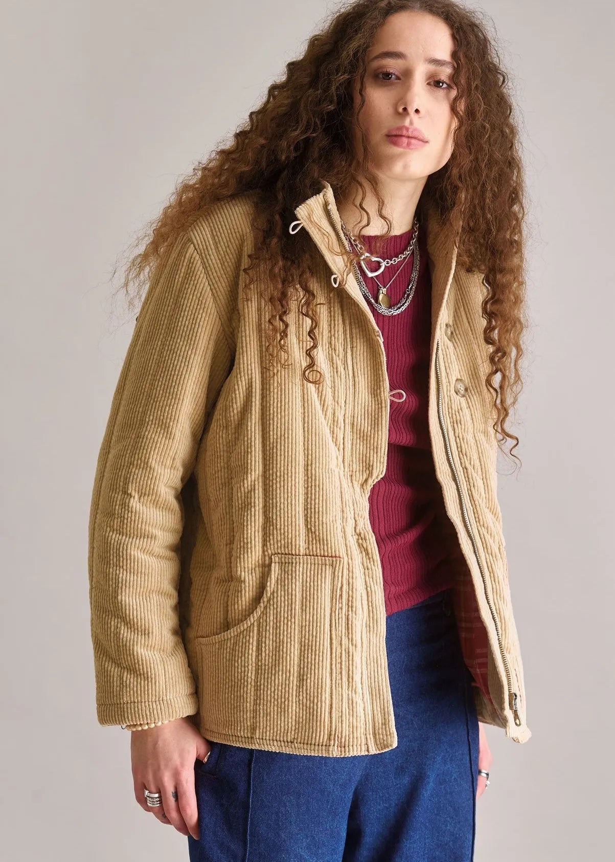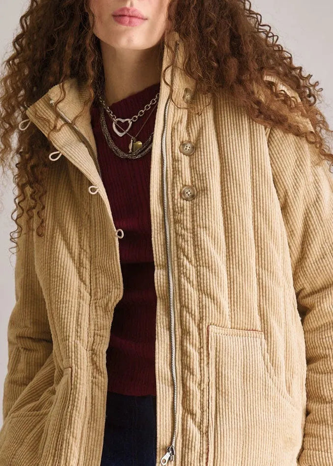 The GEORGIA Organic Cotton Cord Coat in Croissant offers natural warmth and comfort with its 100% organic cotton fabric and recycled polyester padding. Designed with a timeless 6 Wale corduroy texture and a cozy checked flannel lining, this vegan-friendly coat combines style with sustainability. Featuring a high neck, metal zip, and corozo buttons, it provides a reliable fit and eco-conscious details. Crafted responsibly in a Sedex audited factory, GEORGIA is your perfect everyday coat for mindful, effortless wear.