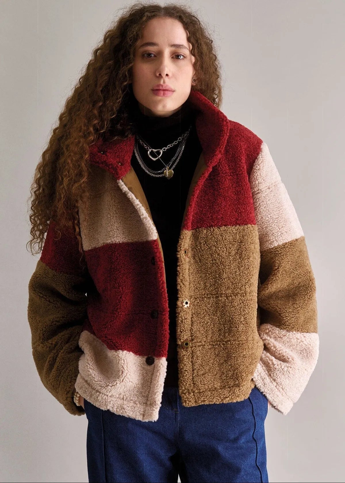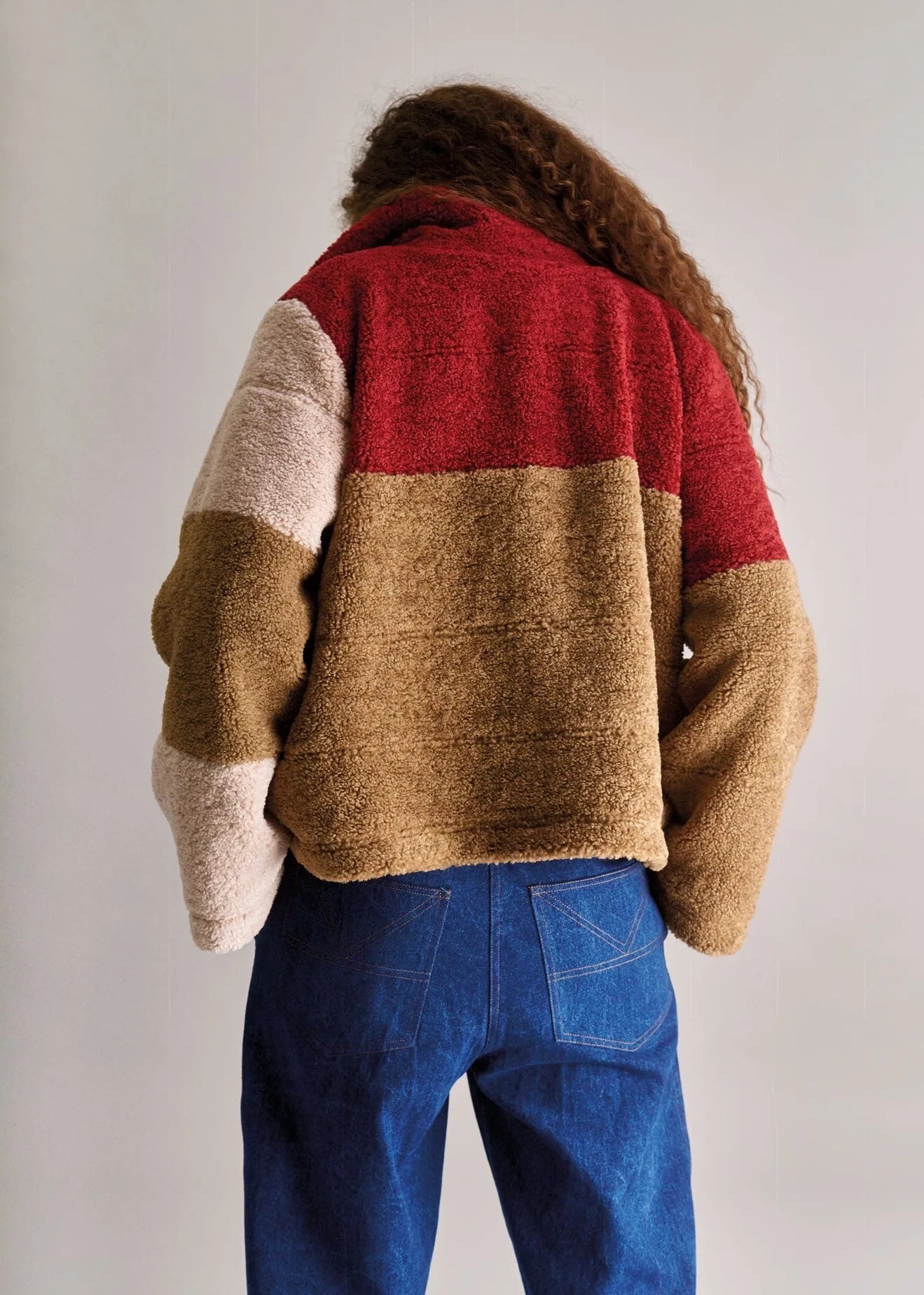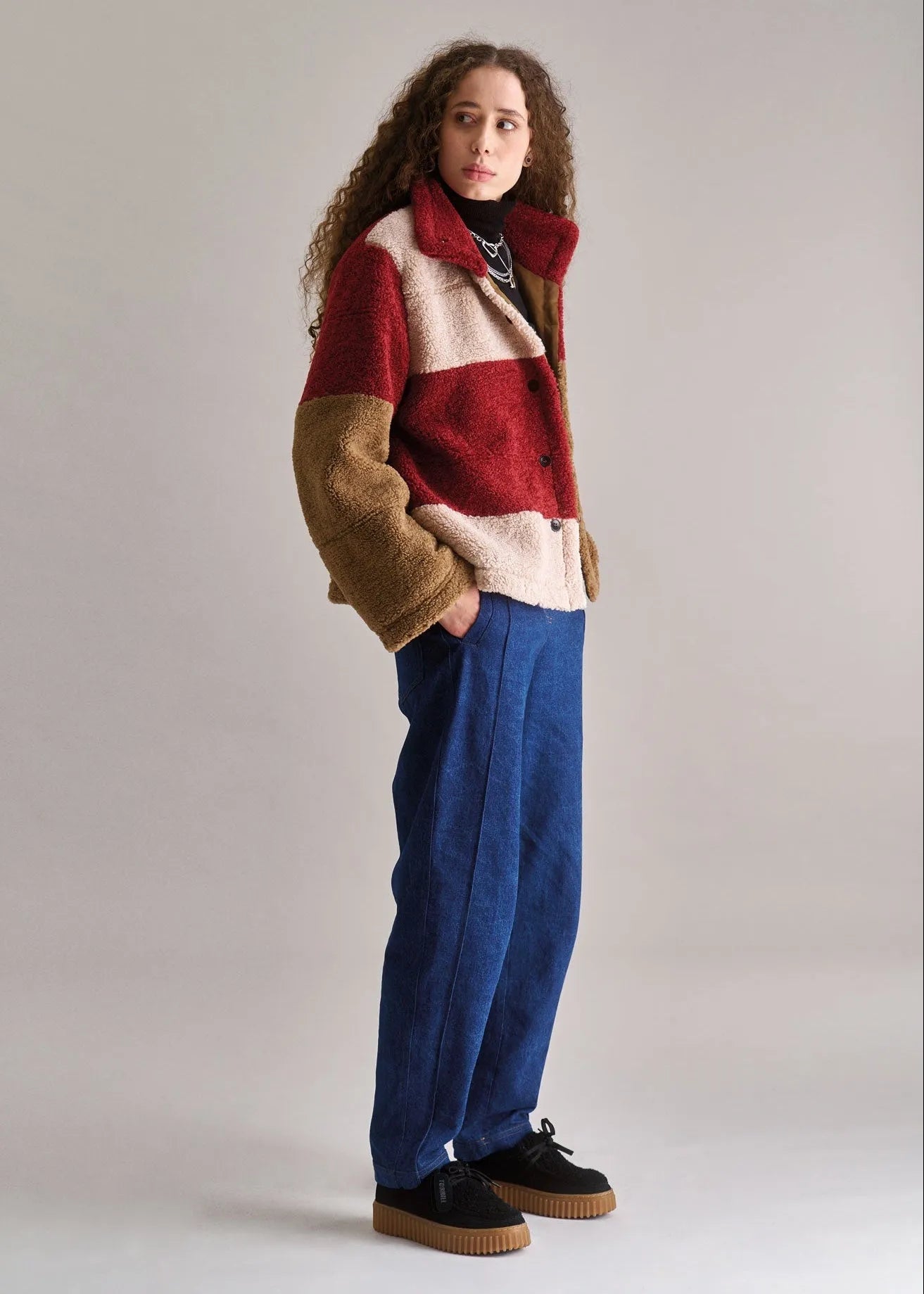 The ISOBEL Recycled PET Jacket combines sustainable materials with relaxed style. Made from 100% recycled PET and 100% organic cotton, this vegan jacket features a high collar and an oversized boxy fit for comfortable layering. Its distinctive patchwork in wine red, sand, and biscuit brings a warm, natural palette to your wardrobe. Finished with metal press stud fastenings and crafted in a SEDEX-audited factory, it offers both ethical production and lasting quality for those who value mindful fashion
