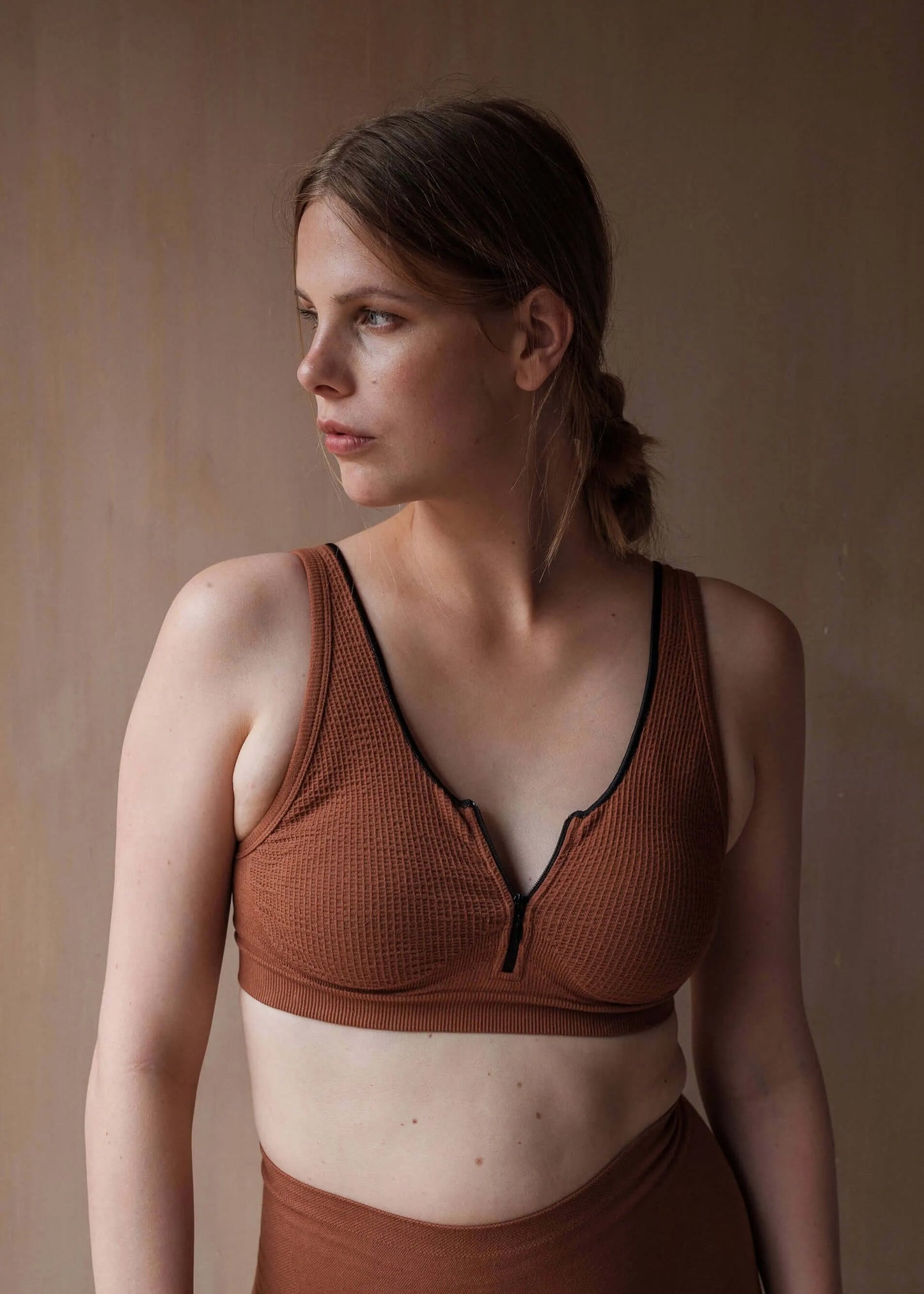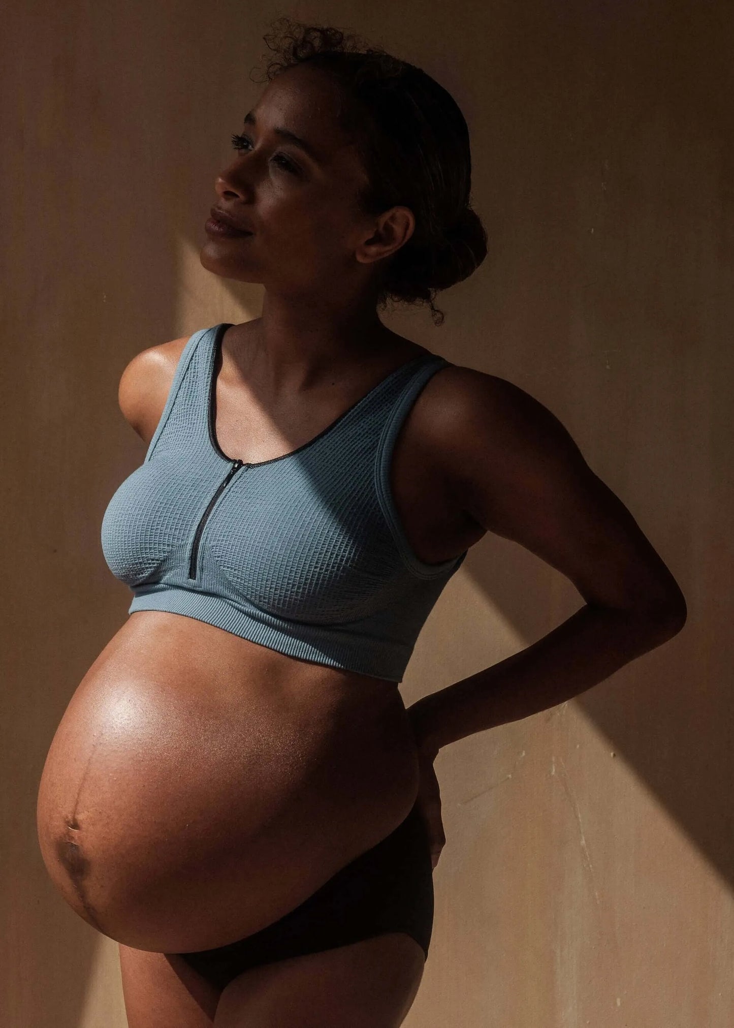 Staying appropriately snug throughout cup size fluctuations, this bra retains its comfort factor thanks to adaptive, seamless knit construction, with no underwire, seams, or even a label to dig in. The zip front fastening means simple access for breastfeeding - or simply adds another level of style and comfort.
