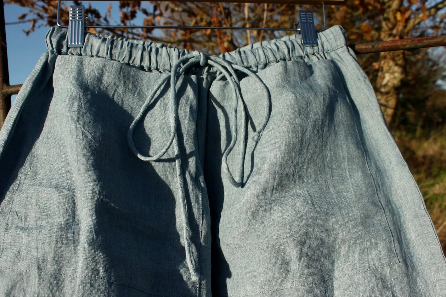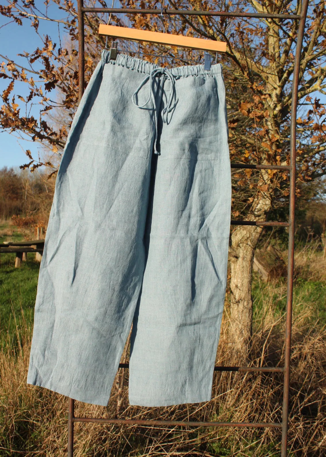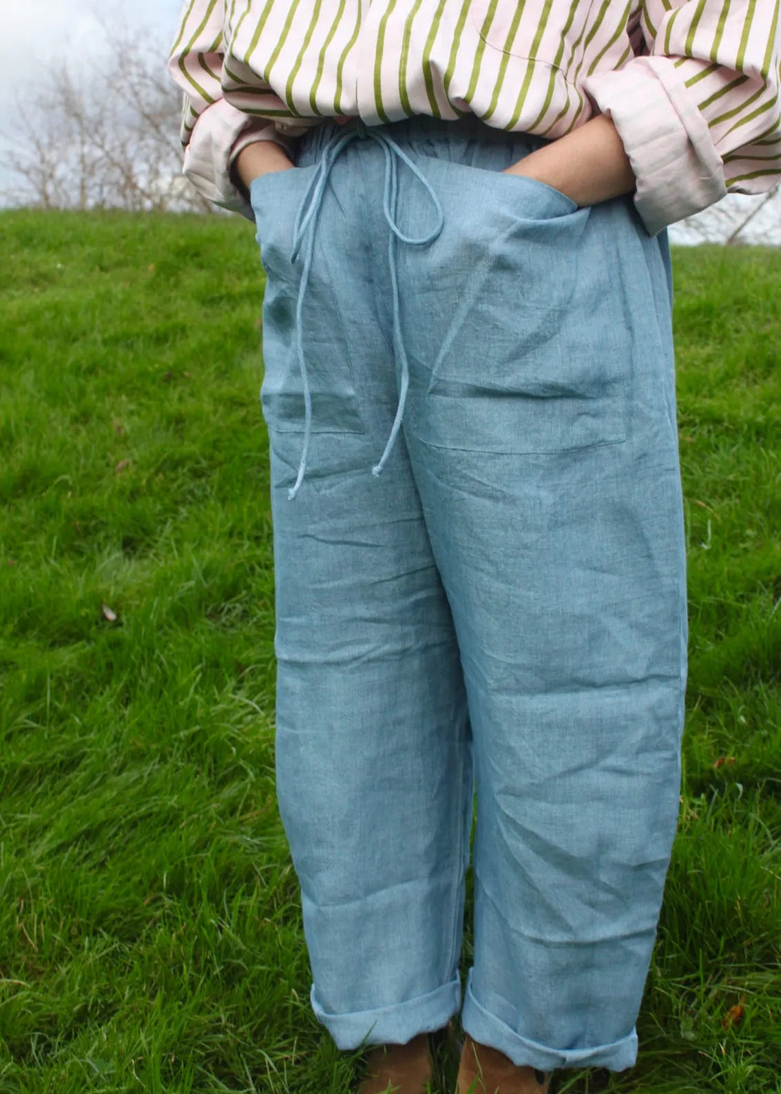 These beautiful slightly barrel legged linen trousers are the perfect staple to wear all year round. In buttery soft linen, these trousers are loose and so easy to wear. With beautiful big front pockets, elasticated, drawstring waist and slightly cropped leg, they are flattering and amazingly comfortable.