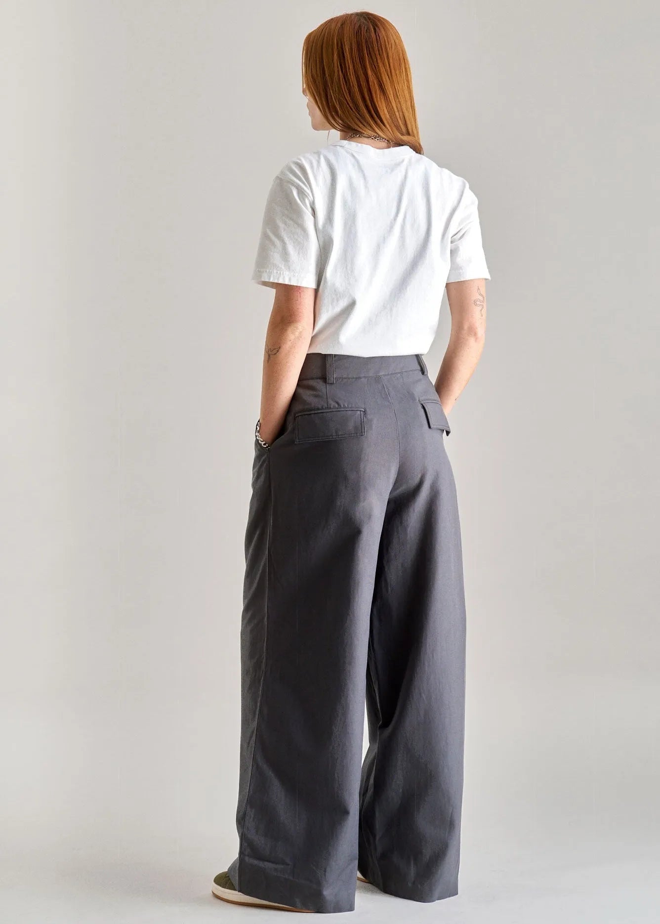 The SOFIA Cotton Tencel Trouser in grey blends 54% organic cotton with 46% Tencel for a conscious yet durable autumn option. Featuring a wide-leg, oversized slouchy fit that’s tailored at the waist, these trousers combine relaxed style with structure thanks to their stiff workwear-inspired fabric. Mid to high rise with flat back pockets, metal clasp, and zip fly, they offer both comfort and practicality. Made in a Sedex-audited, vegan-friendly factory, the contrast stitching adds a subtle, thoughtful detail to an ethically crafted wardrobe staple.