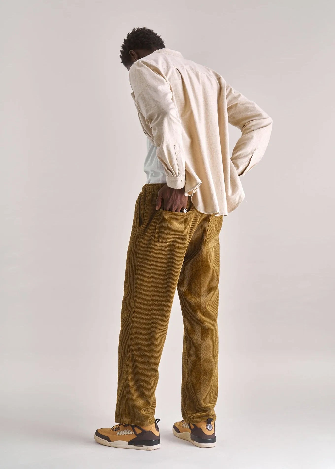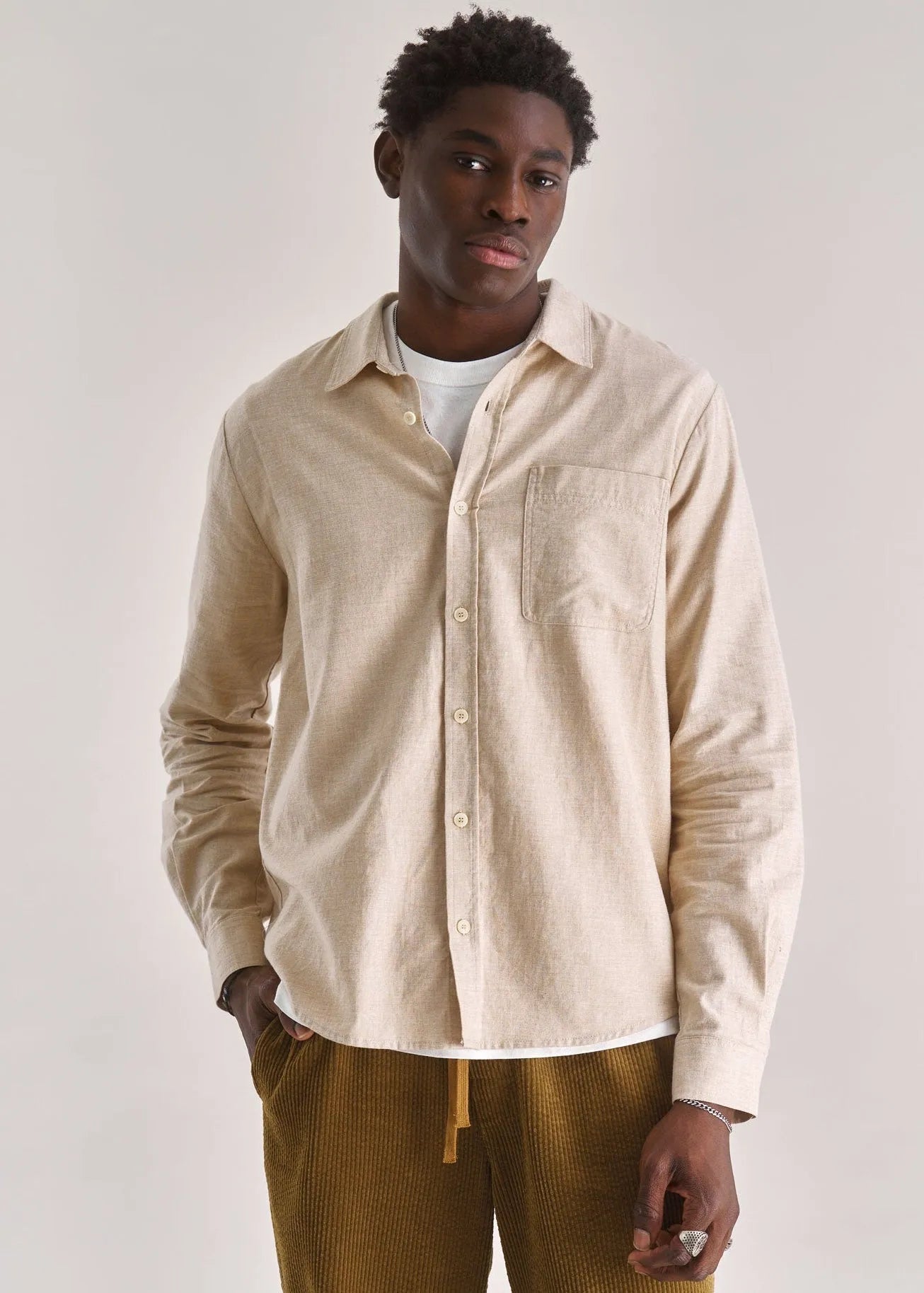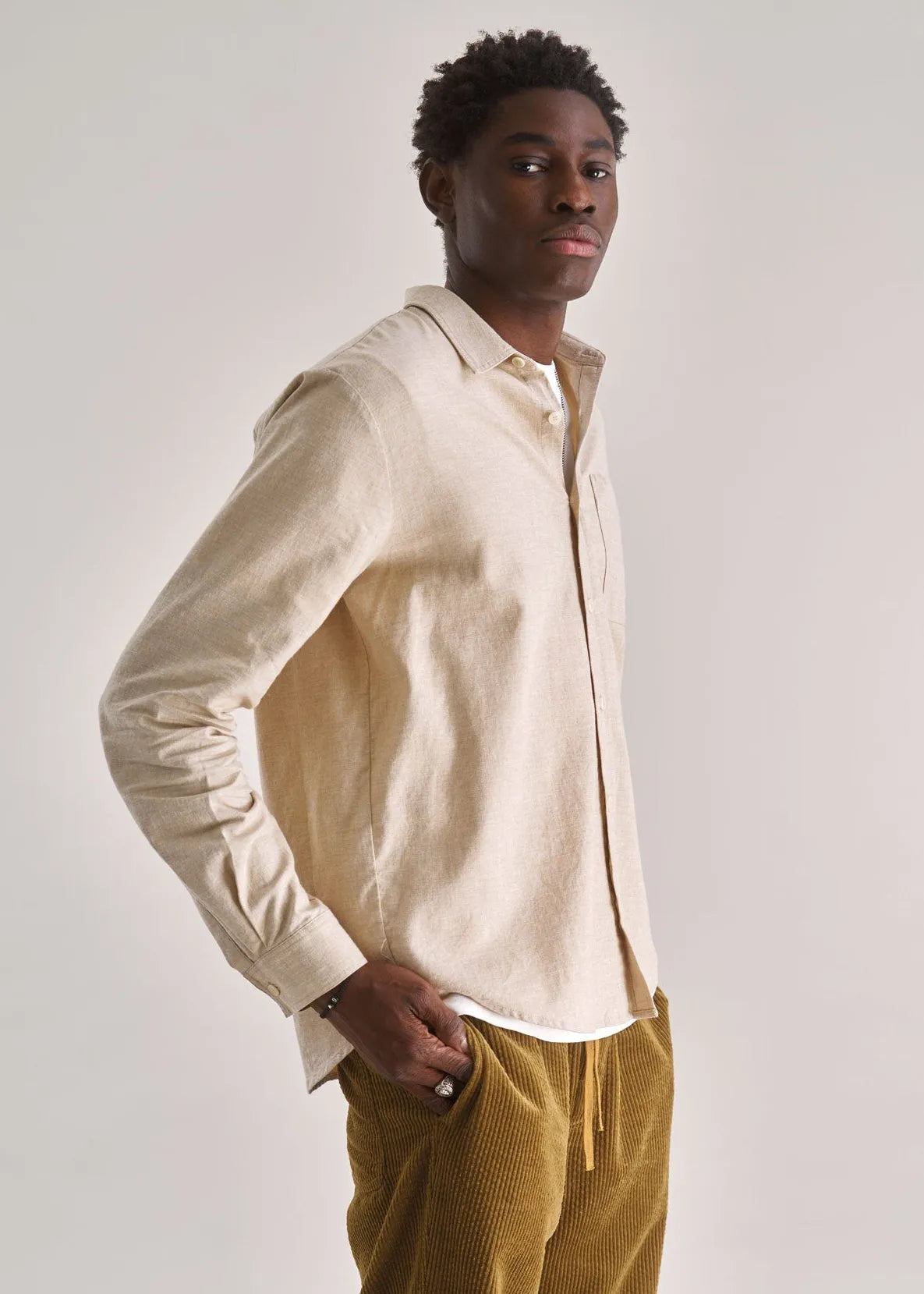 The SPECTRE Organic Cotton Shirt in Sand. Made from 100% organic cotton with a soft brushed flannel finish, this oversized, loose-fit shirt offers breathable warmth and gentle feel. Ethically produced in a SEDEX-audited, vegan factory, it features durable branded corozo buttons for lasting style. Perfect for those who value both comfort and responsible fashion.