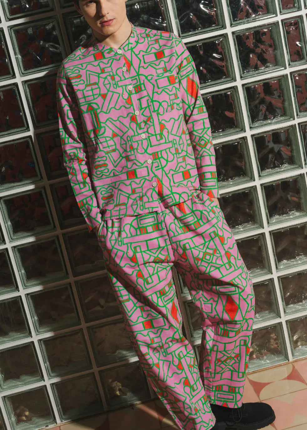 A dreamy interplay of soft pinks, vibrant red, and vivid green, inspired by the quiet magic of a setting sun. A playful balance of structure and fluidity, perfect for effortless elegance.