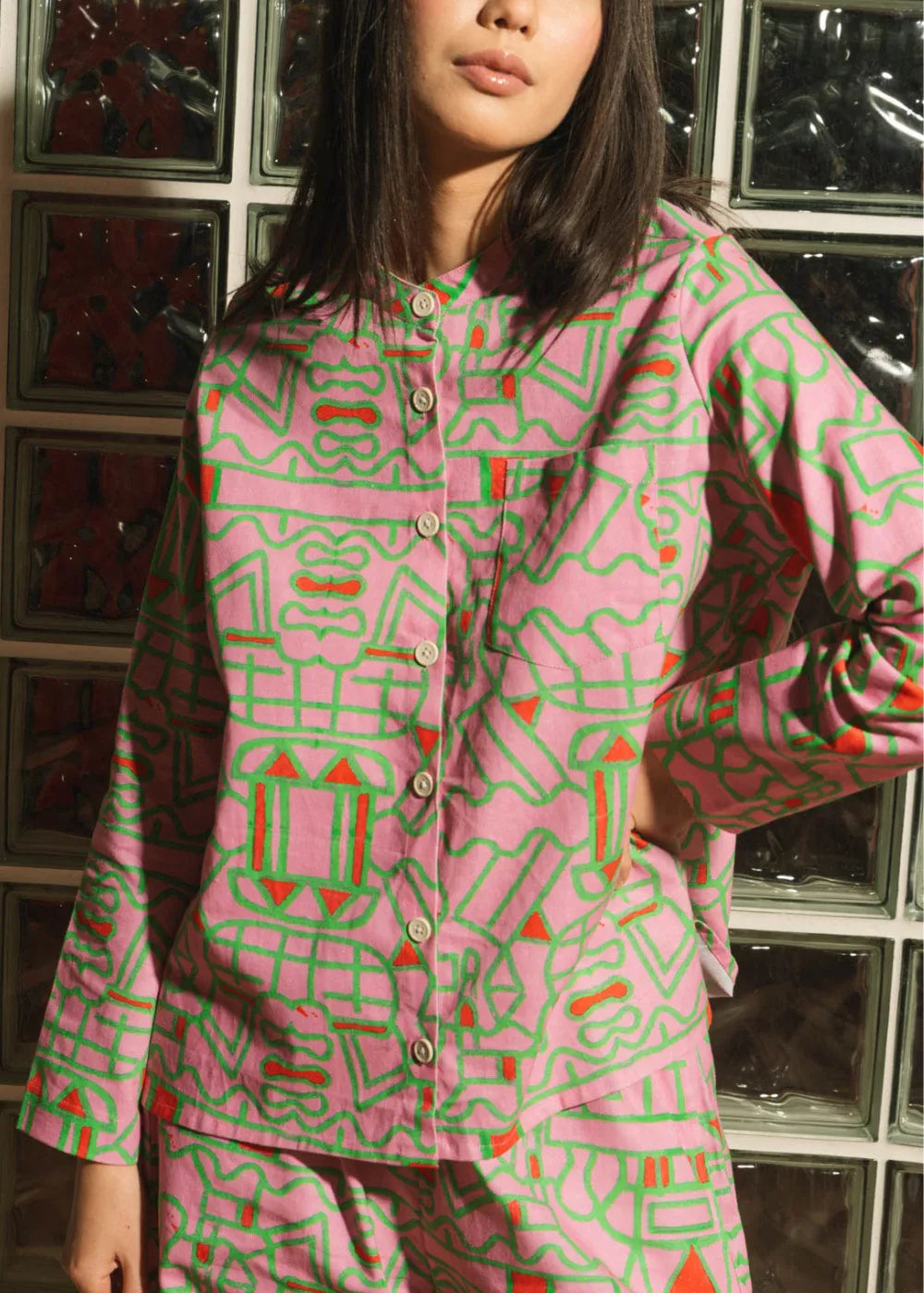 For a carefree style, throw on this soft Organic Cotton and Linen Shirt in Blush Horizon. With a soft oversized silhouette and a charming combination of pink, green, and red this shirt will keep you smiling no matter the season.