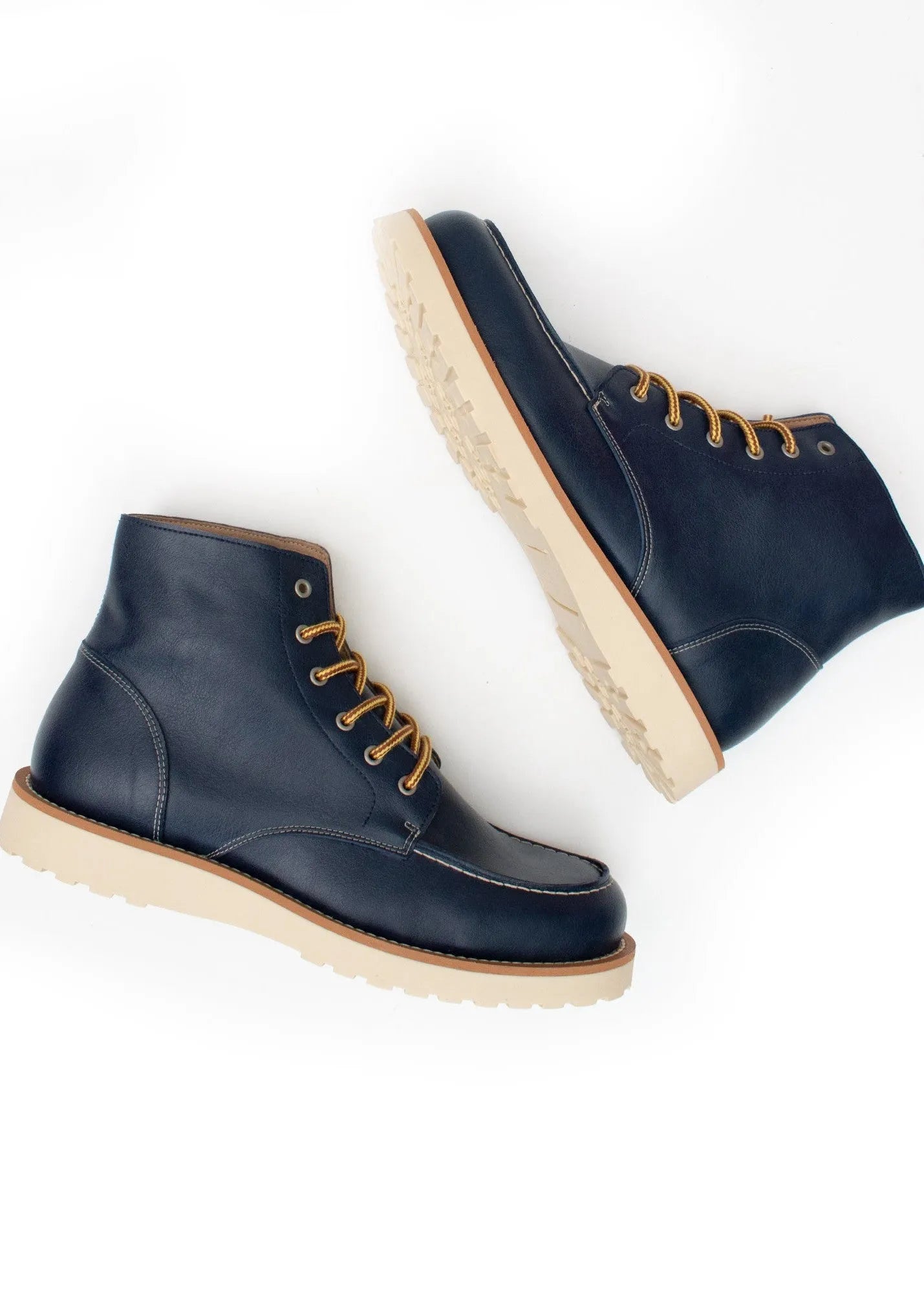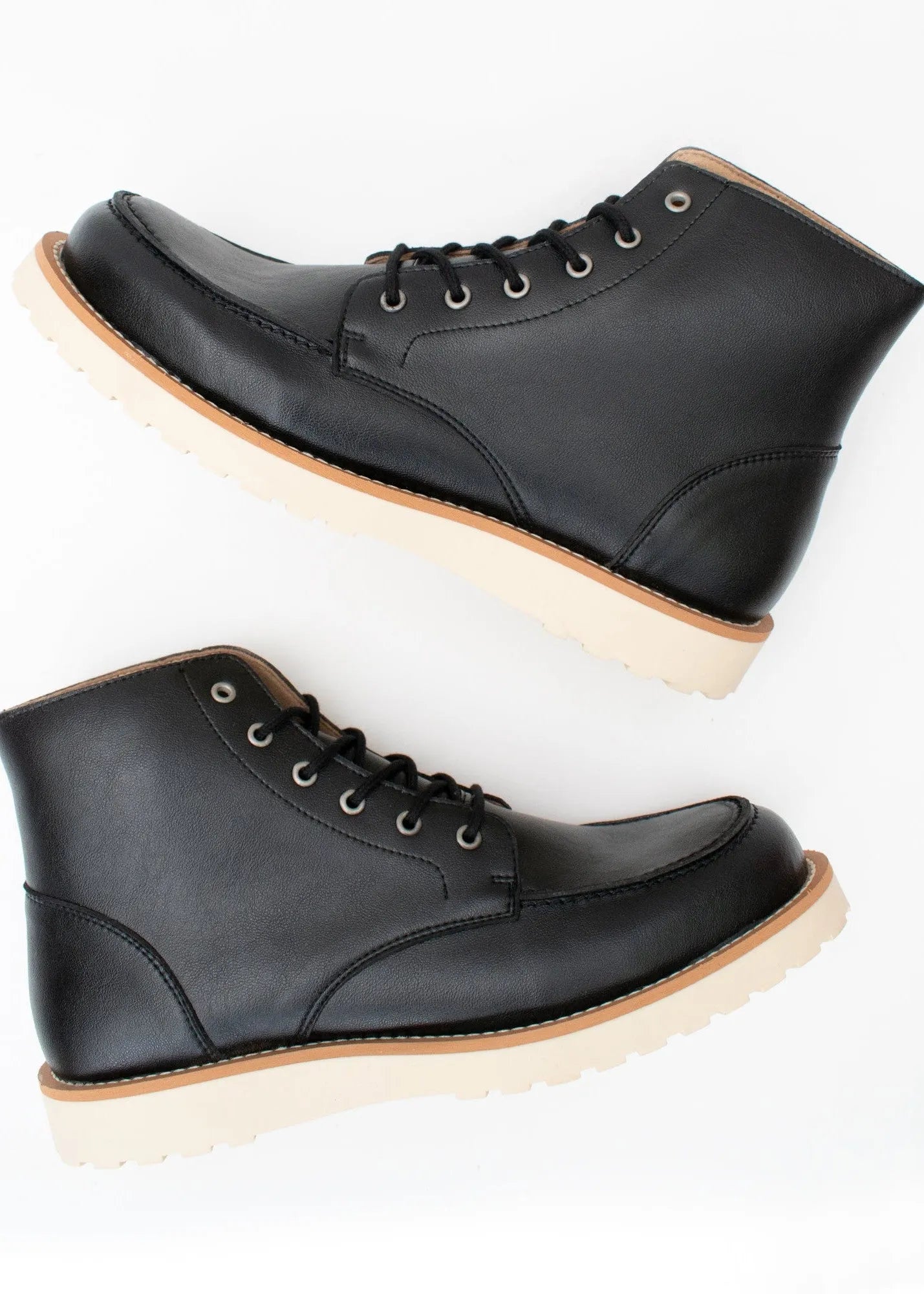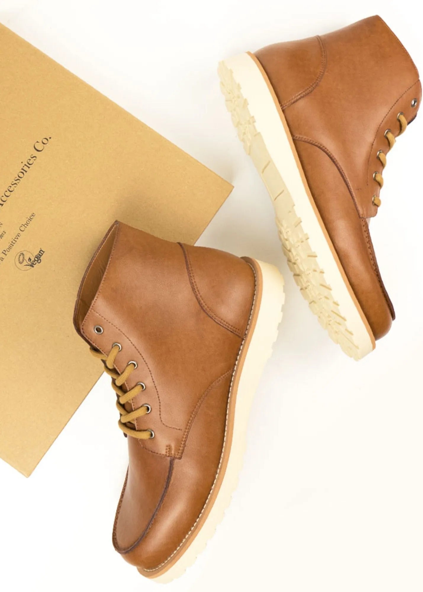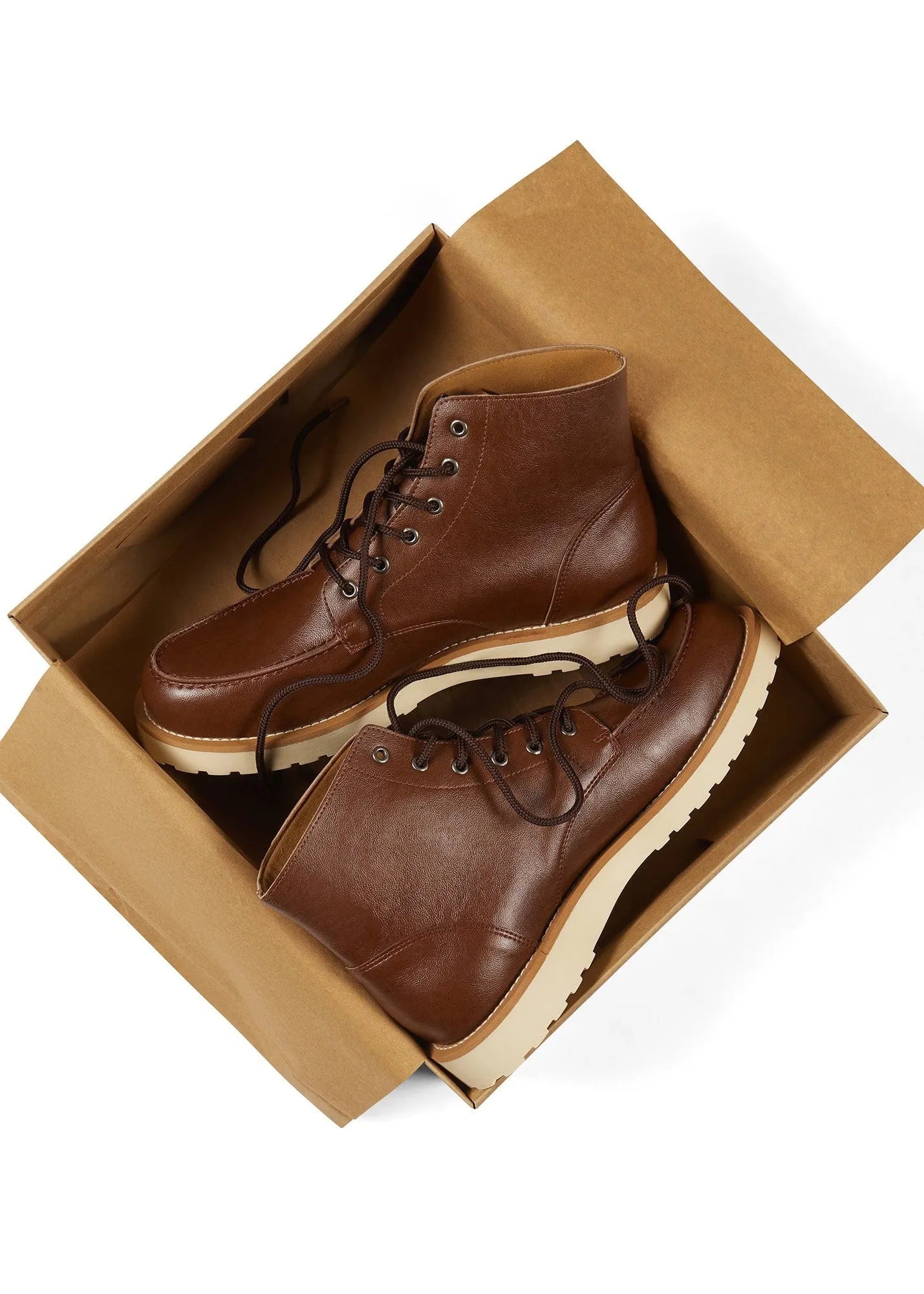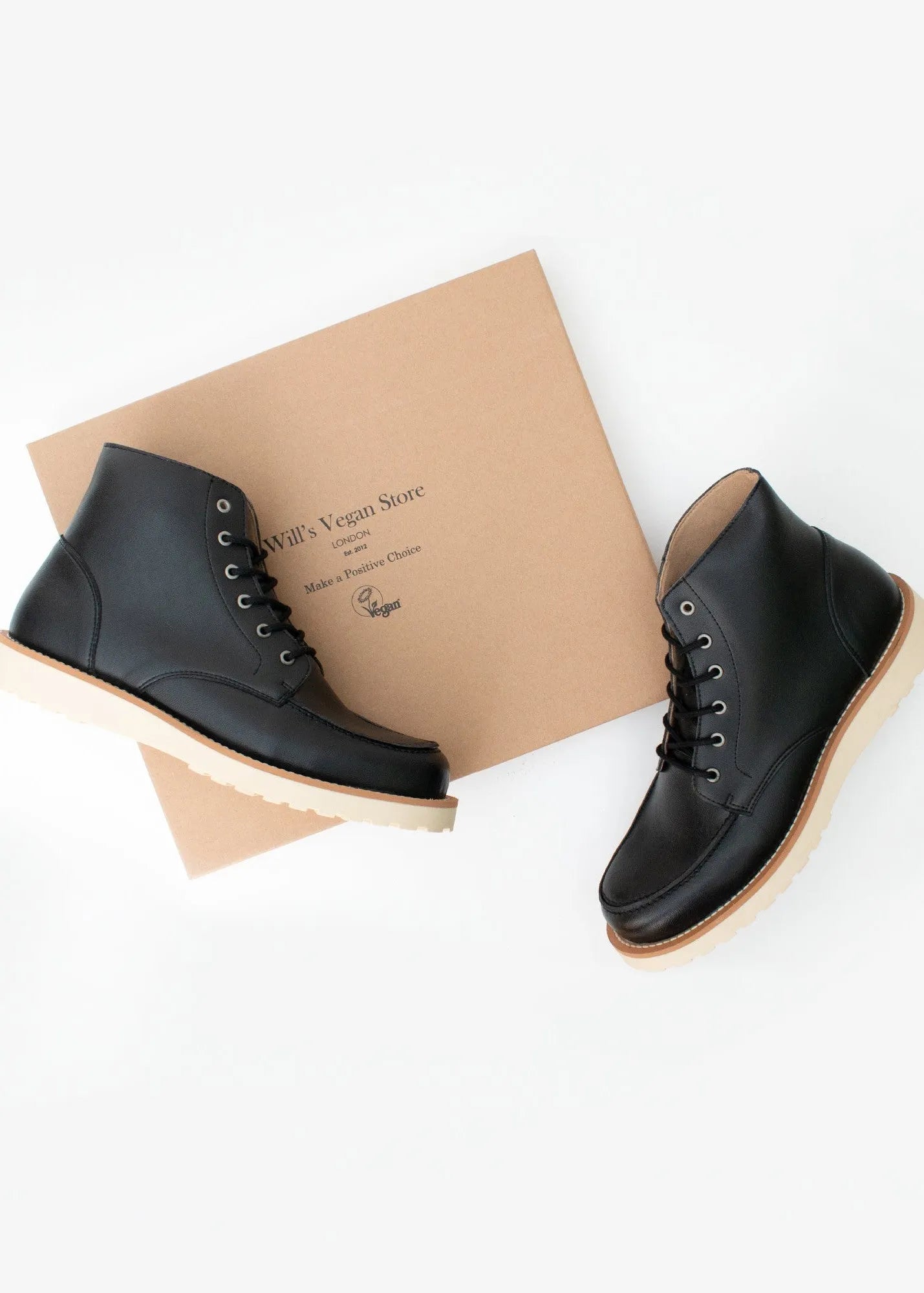 The substantial yet supple Italian vegan leather made with 69% bio-based content moulds to your feet over time, creating a customized fit. The thick recycled polyester laces are sturdy and classic, ensuring your boots stay snugly on your feet. The cushioned insoles and vegan suede lining provide comfort, even after a long day on your feet.