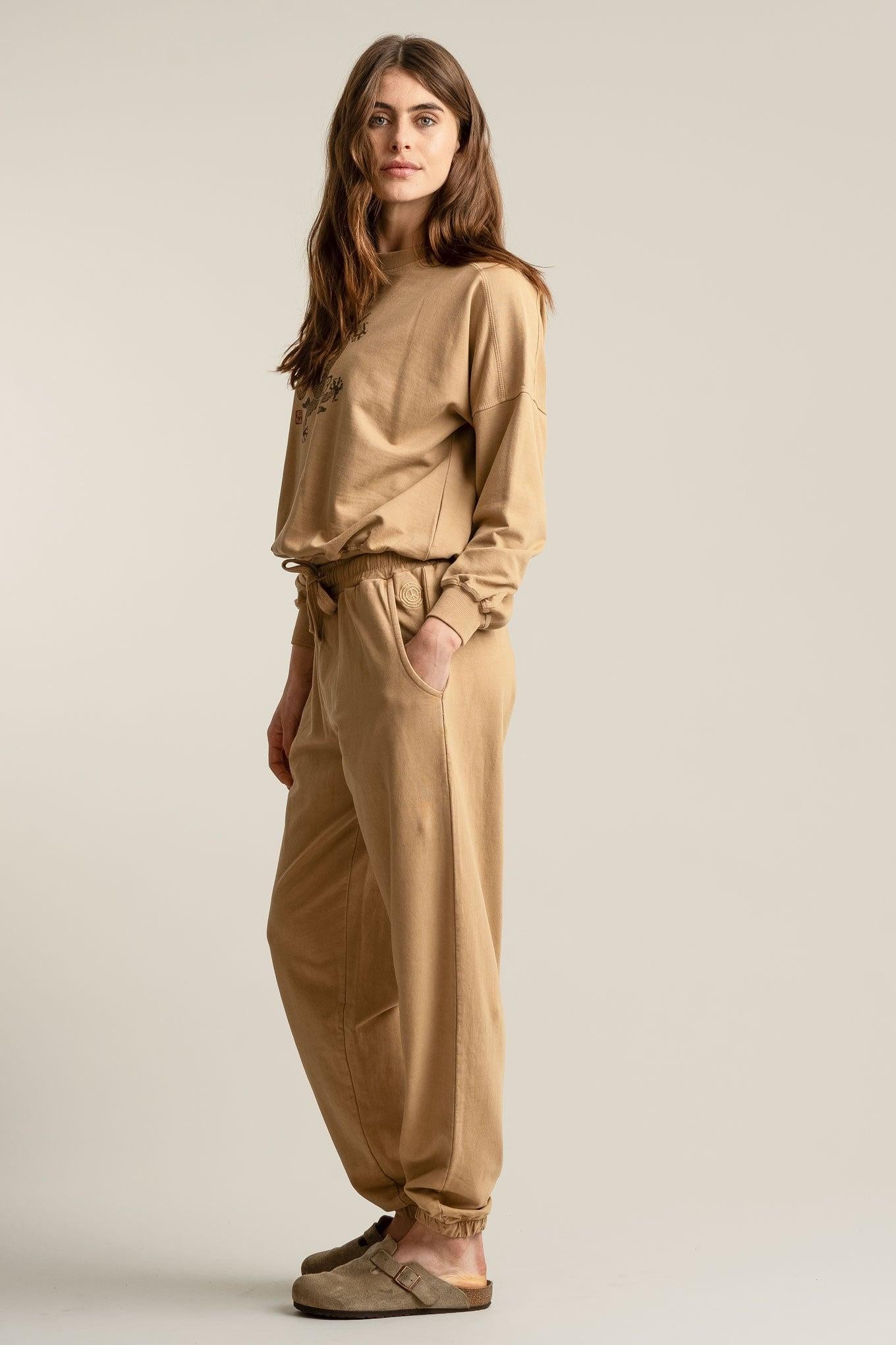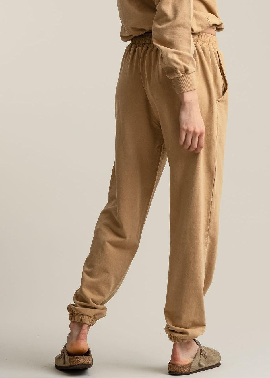The EVIE Organic Cotton Jogger in croissant offers a comfortable, natural fit crafted from 100% organic cotton. Made with light weight loop back sweat jersey, this vegan-friendly jogger feels soft against the skin while providing warmth. Its garment-dyed finish gives each piece a unique, lived-in look, and the elasticated waistband with drawstring ensures an adjustable, secure fit ideal for everyday wear. Perfect for those seeking style and sustainability combined in effortless comfort.
