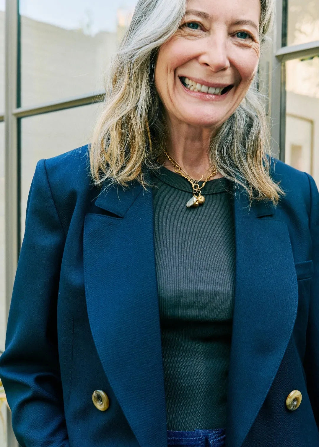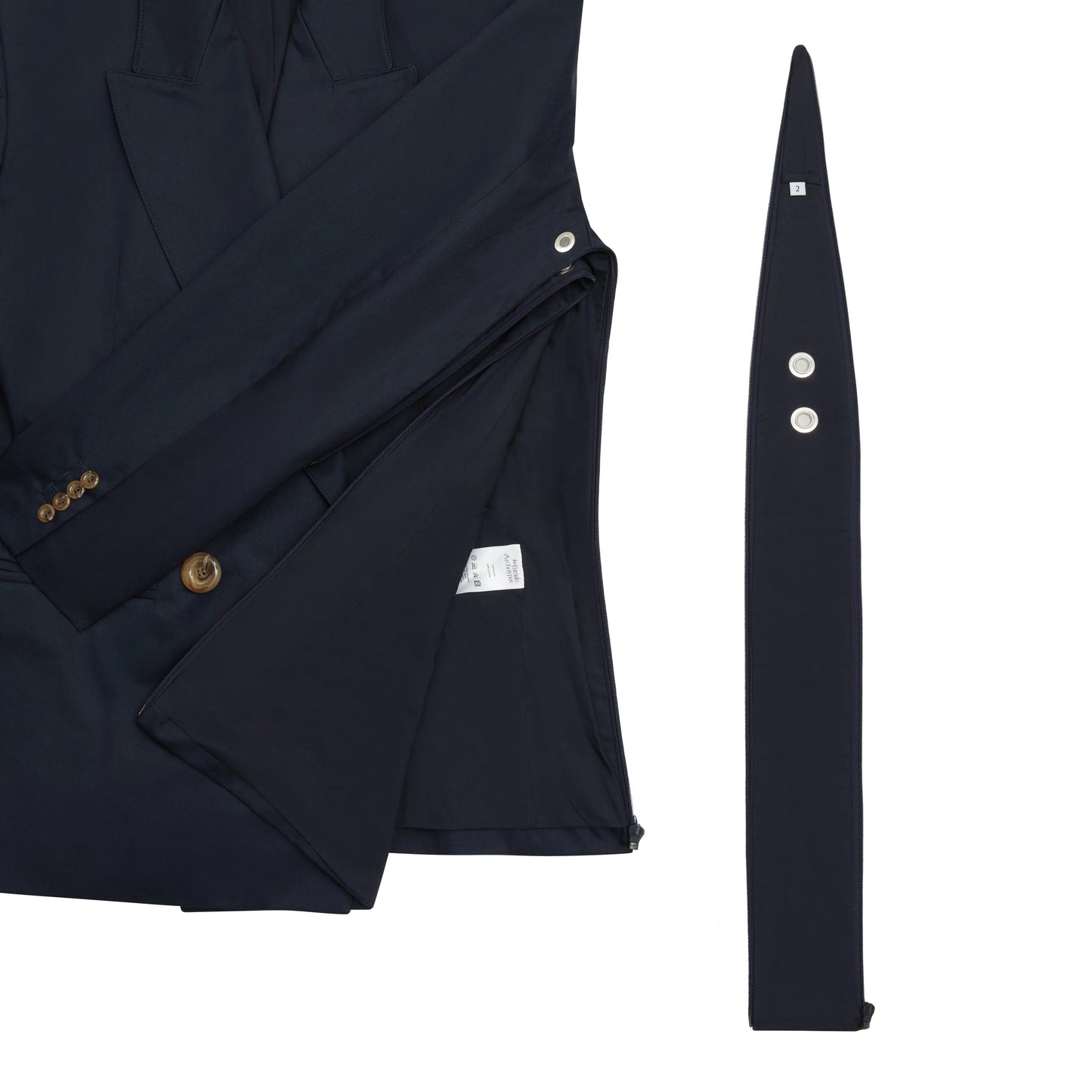 Designed to evolve to suit your needs through a panel system on the side seams; the blazer side seams can be worn closed or you can select and zip in one of three panels.