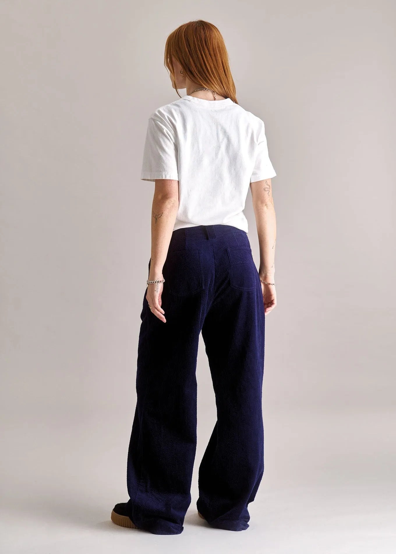 The LOLA Organic Cotton Cord Trouser in navy offers a naturally comfortable fit made from 100% organic cotton with a soft 6 wale corduroy texture. With a mid-rise waist, front pleats, and wide leg design, it provides ease and relaxed style for everyday wear. Produced in a SEDEX audited factory, these trousers reflect a commitment to ethical and sustainable fashion. Finished with a branded metal button and zip fly, they are vegan-friendly and designed for those who value authenticity and responsible production.