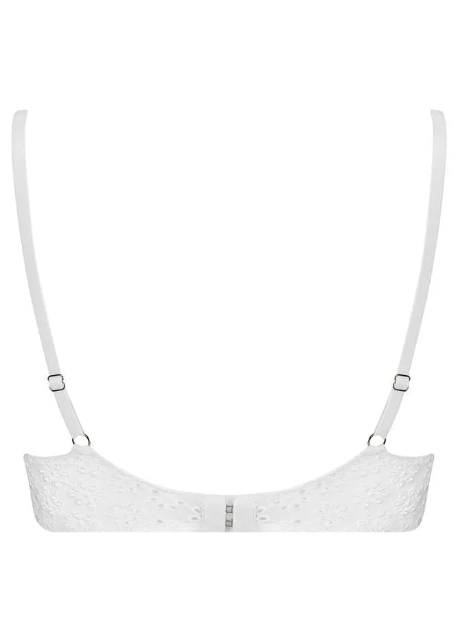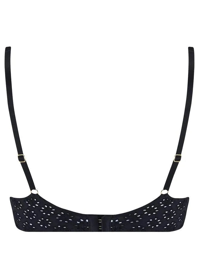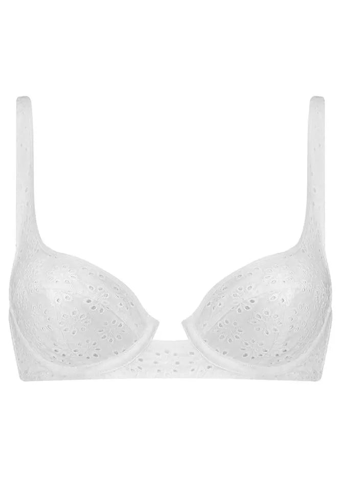 An underwired bra made with 100% organic cotton classic broderie anglaise sourced in Spain, with an organic bamboo trim, and gold-plated accessories made in France. Cut for a super flattering vintage look.