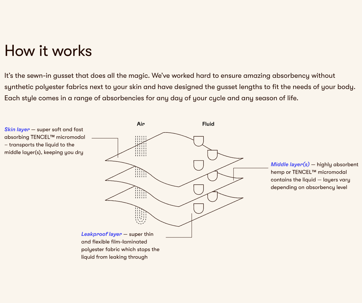 is for the run-up to your period days, the ‘is-my-period-over-yet’ days, light bleed or leak days, heavy discharge, or back-up while wearing the menstrual cup or a tampon. It is basically the revolutionary built-in panty liner, just the much better version where nothing moves around or folds and no glue sticks to your skin. You literally feel like you’re wearing regular underwear, zero thickness, full flexibility, and then you have the added benefit of feeling protected. We love this absorbency that works for so many different uses.