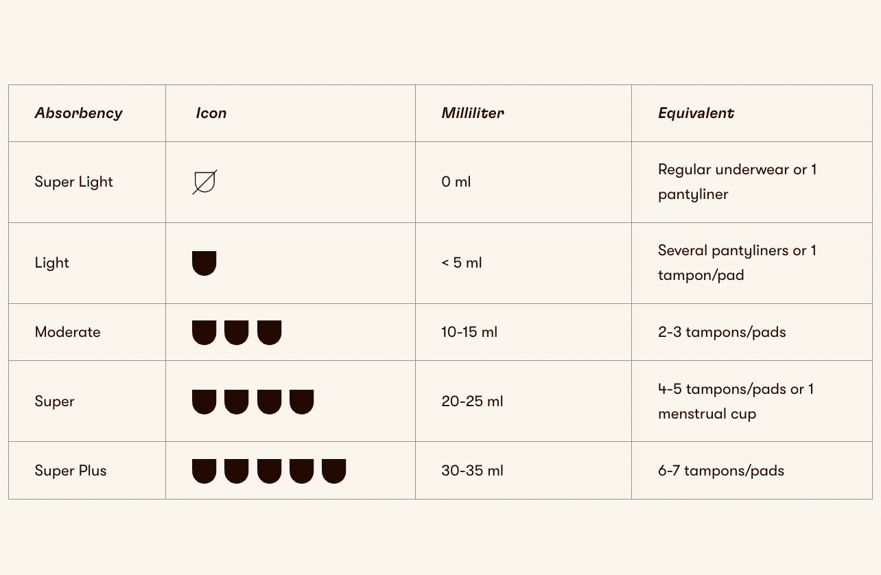 Choosing the right absorbency is not rocket science, but it can definitely be a bit confusing in the beginning. A good place to start is to track your current use of period products. How often do you empty a full menstrual cup or how many pads, tampons or liners do you use throughout your monthly cycle? Then compare this to our absorbency explanations below.
